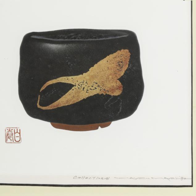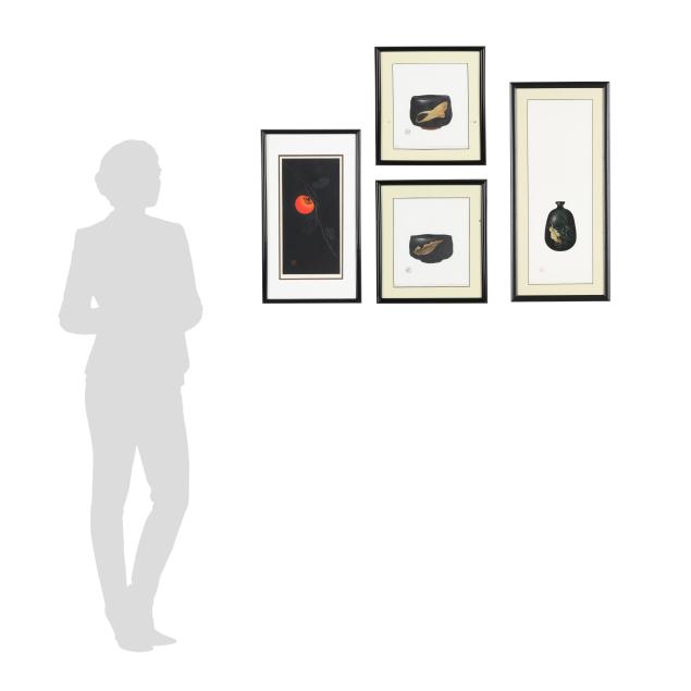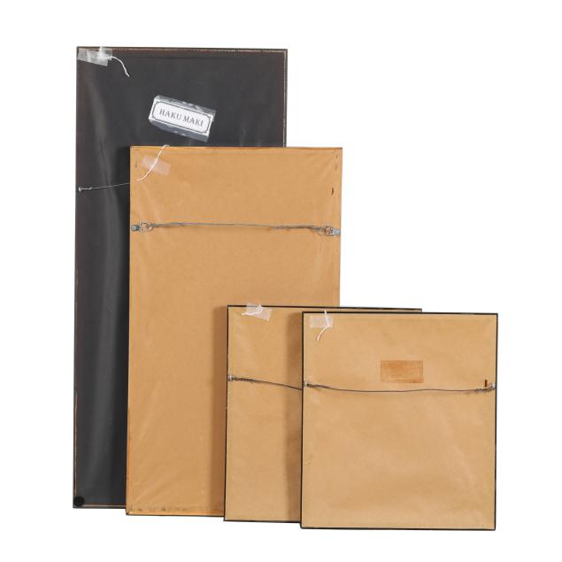 Includes four intaglio woodblock prints, the first a vase with gold leaf, with red artist seal to lower left corner, edition 106/130, title Collection 60, and signed Haku Maki to lower margin, framed with mat under glass (Frame dimensions 29 1/2 x 13 1/4 in.)(some scattered foxing), the second a pomegranate on a black branch, with red artist seal to lower left corner, edition 114/155, title Work 75-42, and signed Haku Maki to lower margin, framed with double mats under glass (Frame dimensions 23 1/2 x 13 in.)(even light toning to margins), the third and fourth both feature a black tea bowls with gold leaf, with red artist seal to lower left corner, each with edition numbers, titles, and signed Haku Maki with year to lower margin, framed in identical manner with mat under glass (Frame dimensions 29 1/2 x 13 1/4 in.)(some marks to glass).