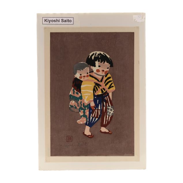 Circa 1940s, includes four woodblock prints of children in Aizu, Japan, two prints of little girls carrying dolls (print size 15 1/4 x 10 7/8 in.), and two prints of a standing boy (Print 15 3/8 x 10 3/4 in.), all prints presented loose over foam mats with clear photo corners.