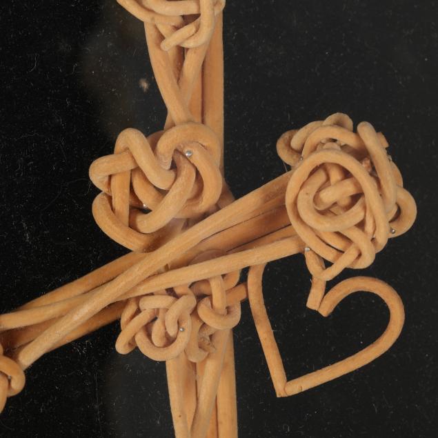 20th century, possibly a sailor's valentine, fibrous cord-like structure knotted in the form of a boom and mast cross, festooned with anchor and heart atop a plank form base, float mounted within an antique giltwood frame with dark upholstered interior.