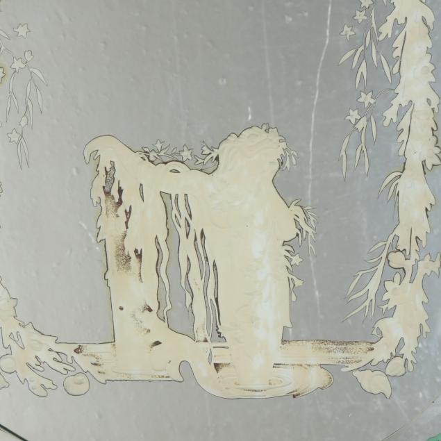 Continental, circa second quarter 20th century, of oval form, with applied lozenge form mounts the center decorated with a nymph rising from a forest pool, surrounding by floral swag, mounted to a conforming ebonized wood backing, unmarked.