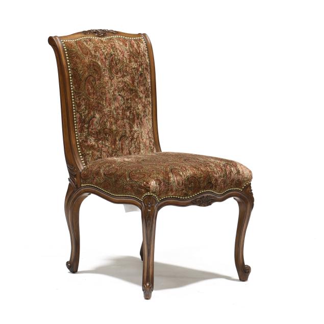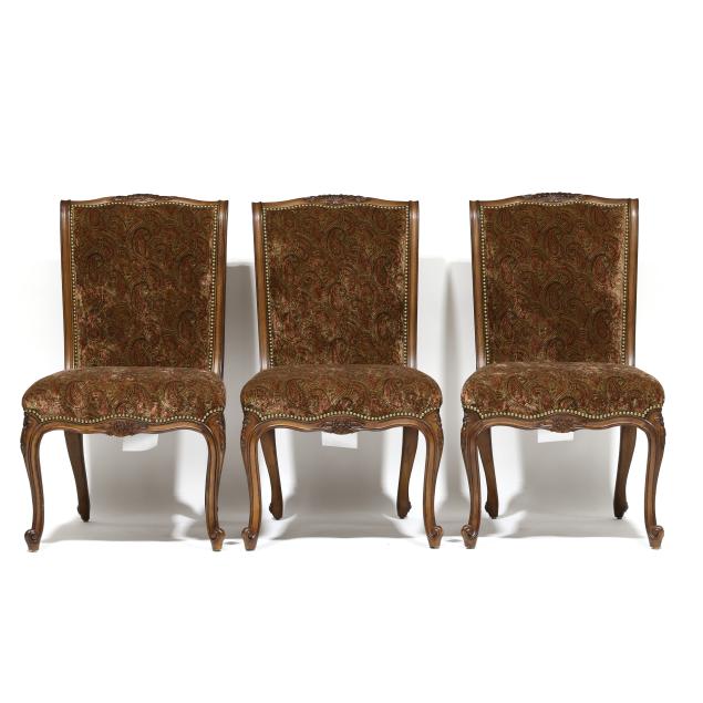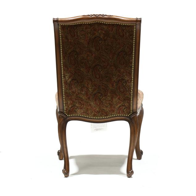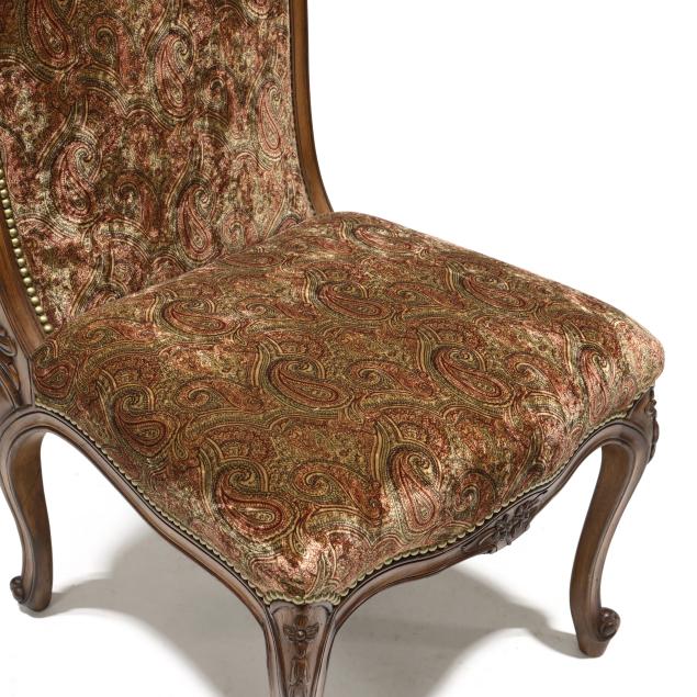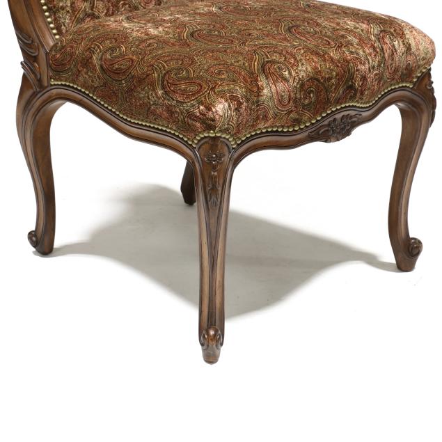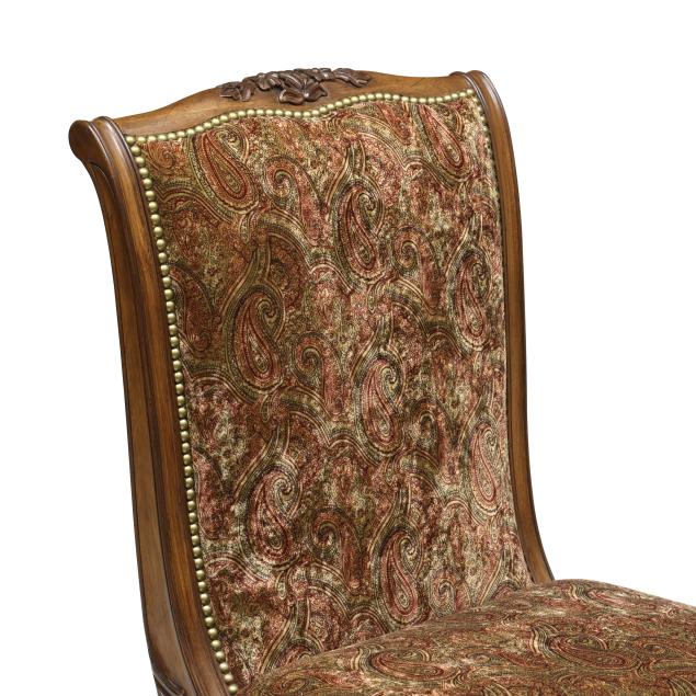 Contemporary, carved and distressed mahogany frames, plush paisley upholstery with brass tack trim, cabriole legs, labeled.