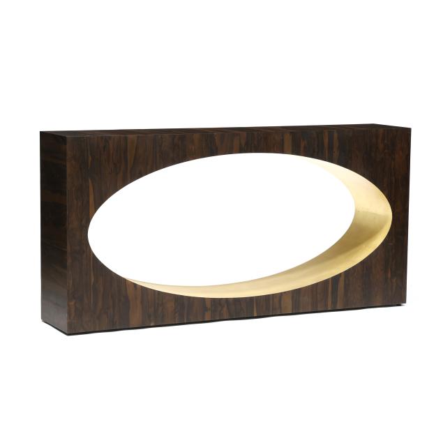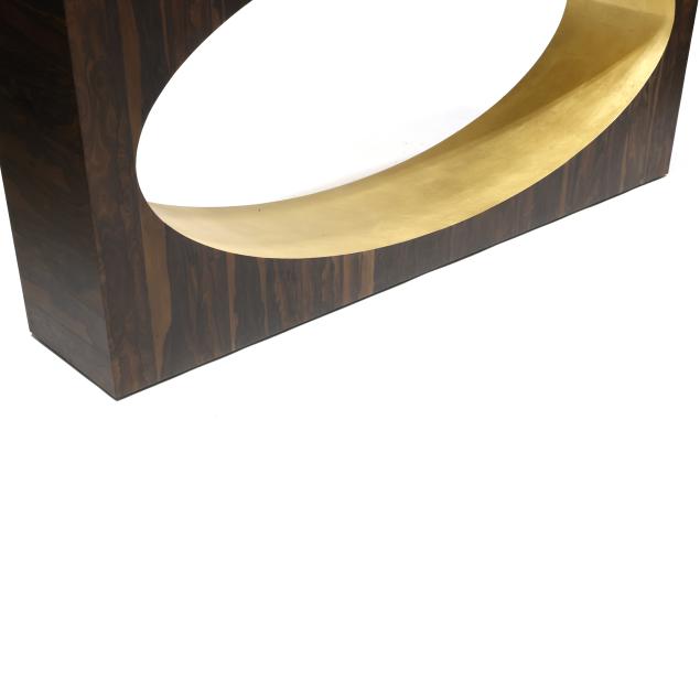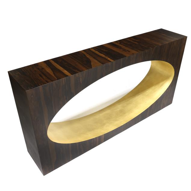 Contemporary, Ziricote wood veneer, rectangular form with central oval in gold leaf, small plastic disc feet, unmarked.