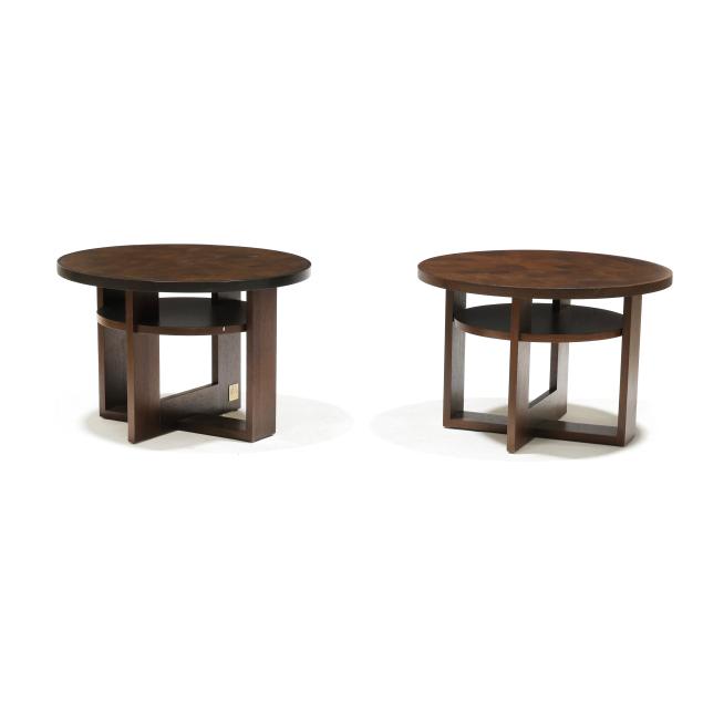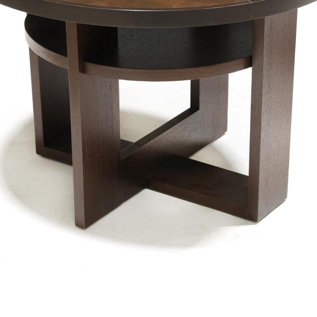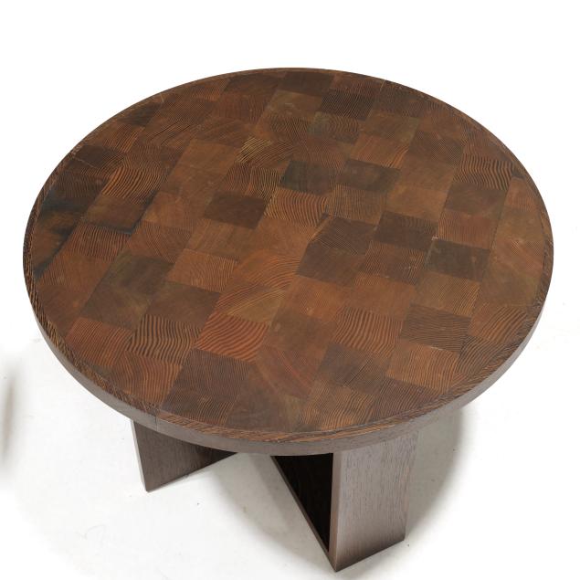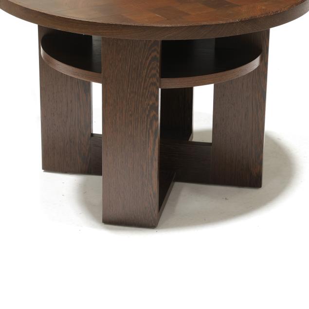 Contemporary, for EJ Victor, circular butcher-block style top, lower shelf, four straight legs with stretcher base, one with hang tag (otherwise unmarked).