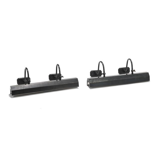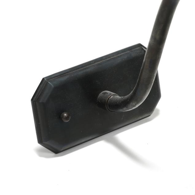 Contemporary, three light form, brushed bronze tone metal with adjustable double arm wall mount supports, labeled.