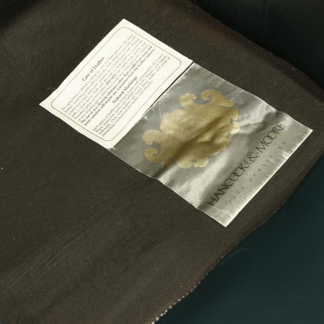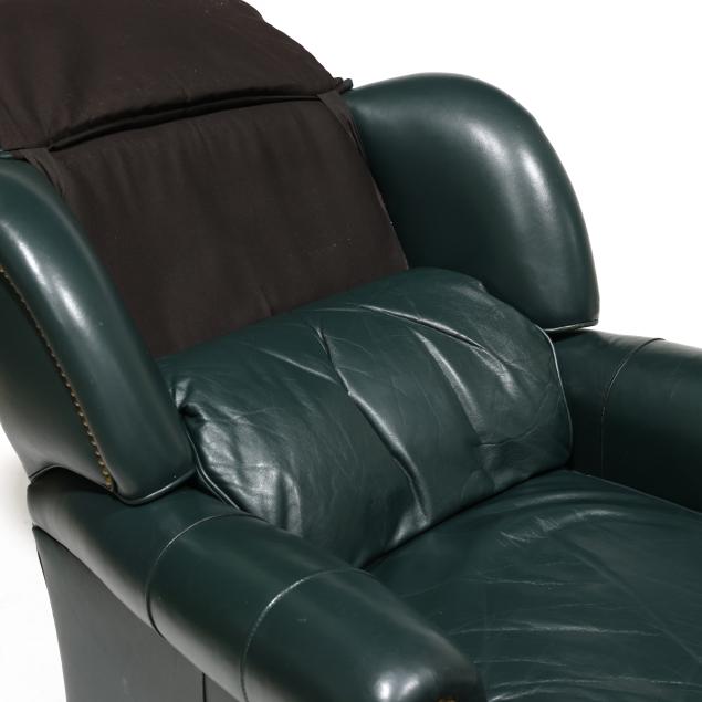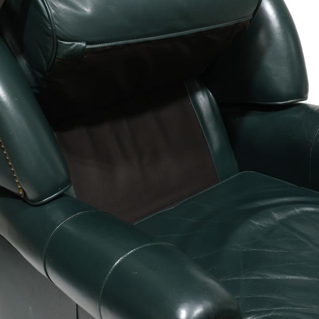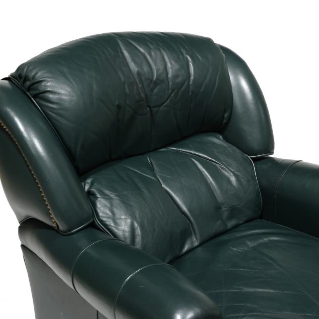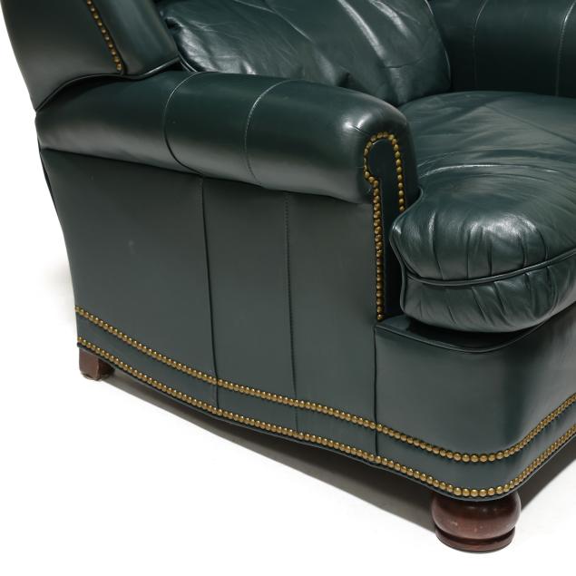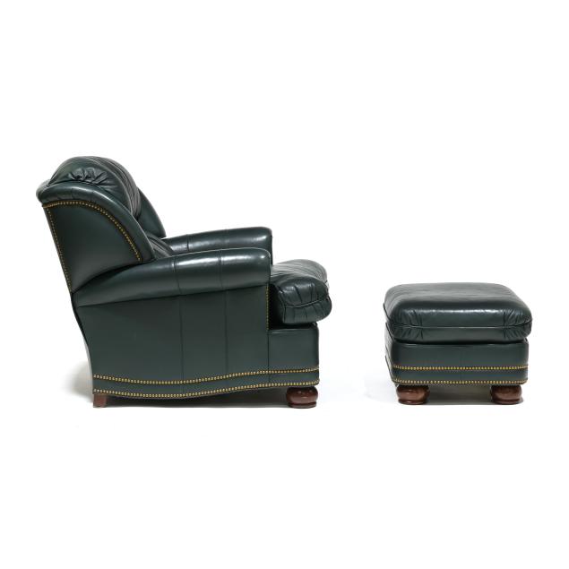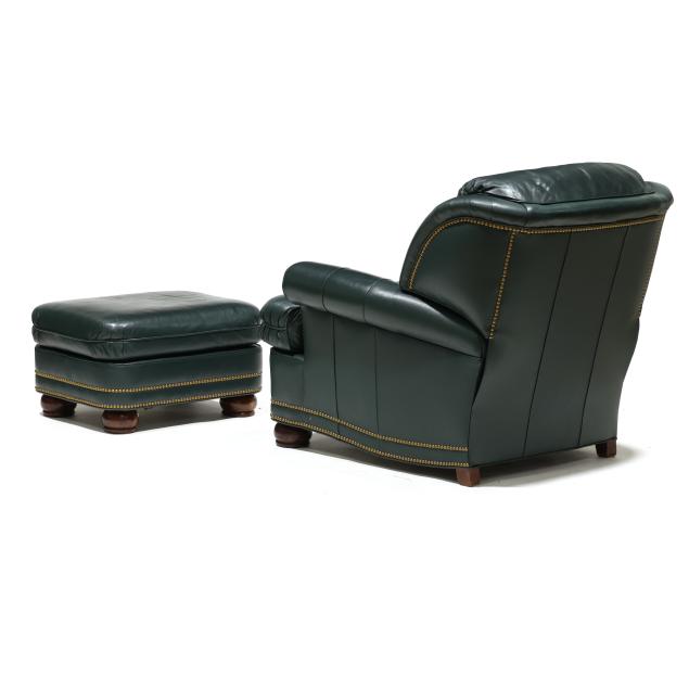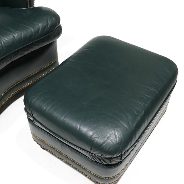 Late 20th century, dark green leather upholstery with brass tack trim, the chair with two stationary back cushions and single loose seat cushion, conforming rectangular ottoman with stationary cushion, turned wood feet, labeled.