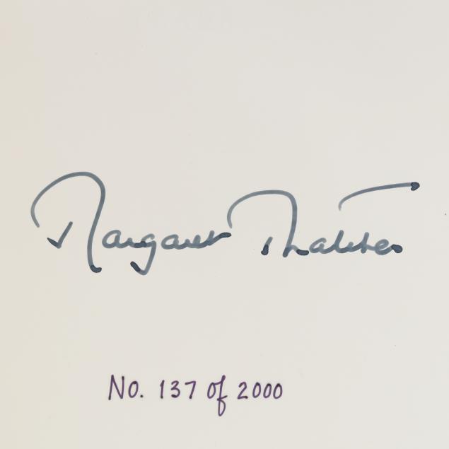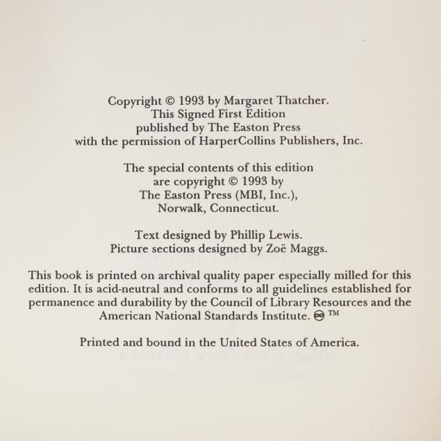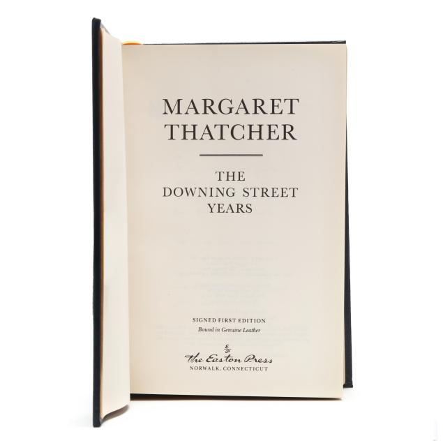 Margaret Thatcher. THE DOWNING STREET YEARS. Norwalk, CT: The Easton Press, [1993]. First edition; limited issue, no. 137/2000. Signed by Thatcher on the tipped-in limitation page, as issued. Bound in gilt-stamped leather with raised bands on the spine, moire endpapers, all edges gilt, and ribbon bookmark. 8vo; xiv, [1-2]-914pp.
