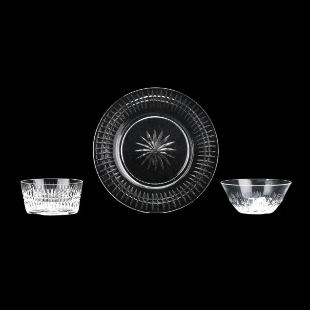 First half 20th century, including (12) plates (9 in. diameter); (7) matching bowls (4.25 in. diameter); and (12) associated finely cut glass bowls (5 in. diameter), all appear unmarked.