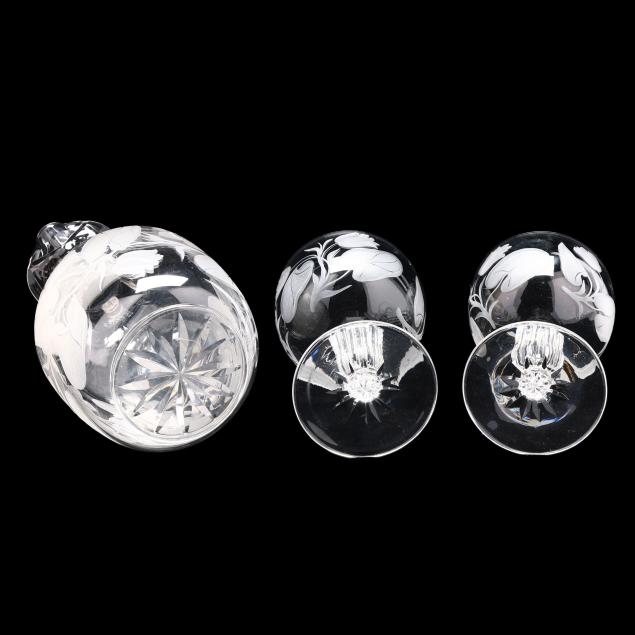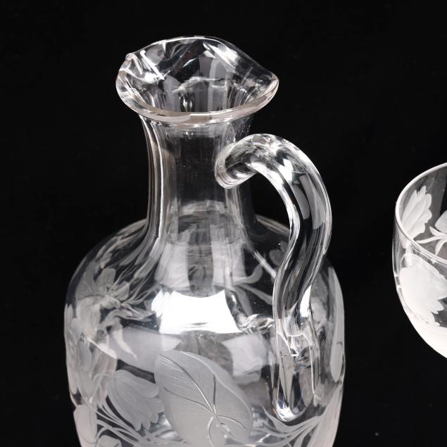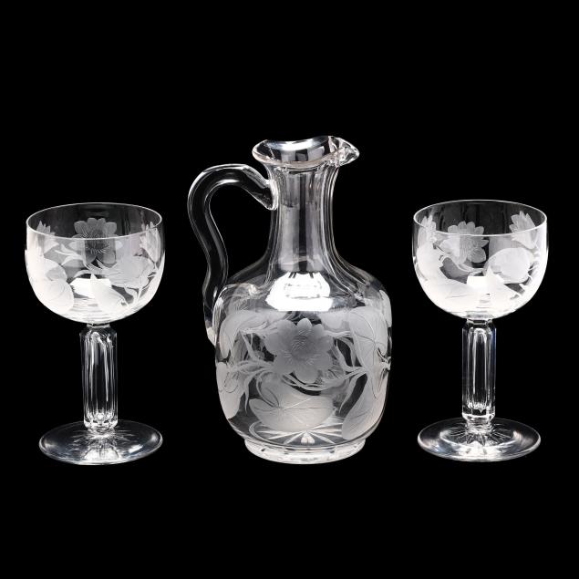 England, late 19th century, including a pitcher with applied handle, and a pair of goblets with air trap faceted stem, all with engraved lotus and lily pad motifs and underside cut star foot, appears unmarked.