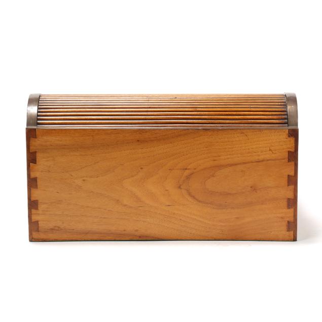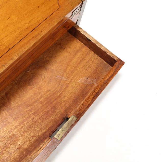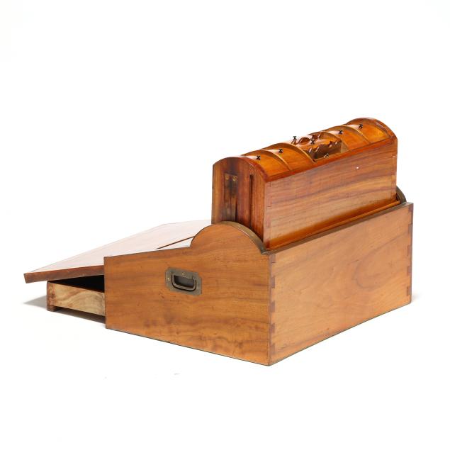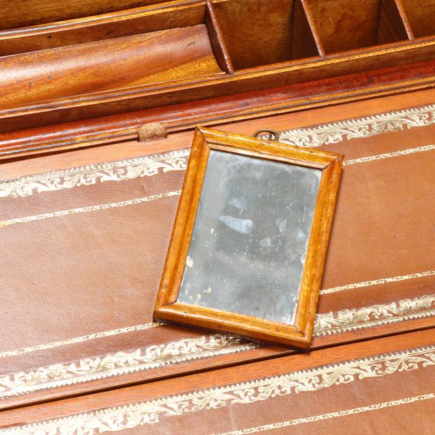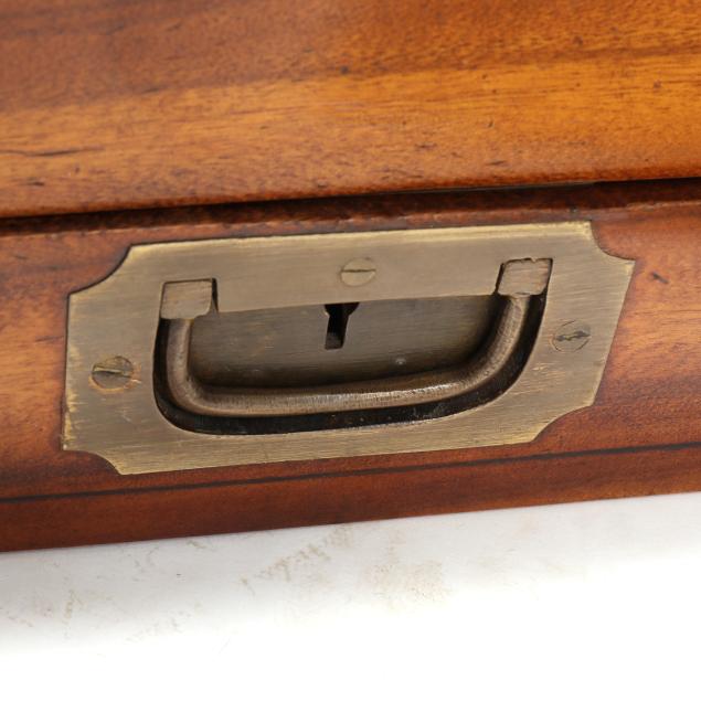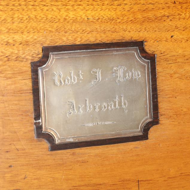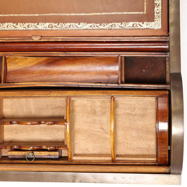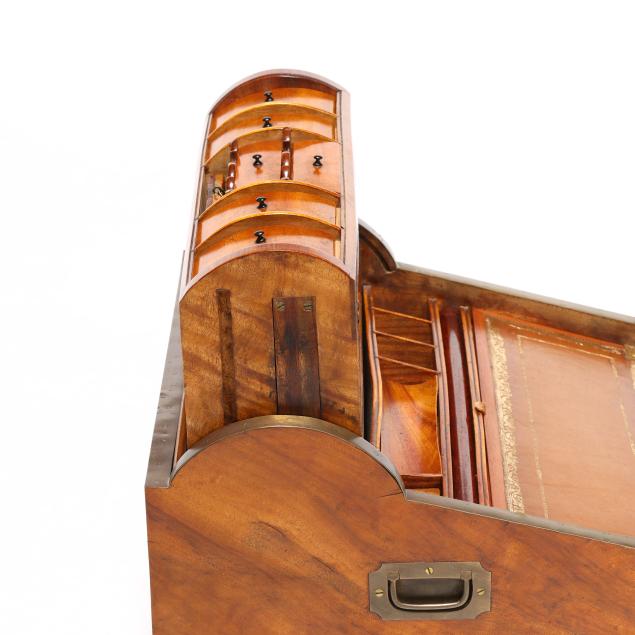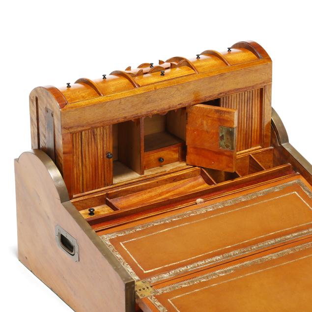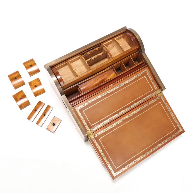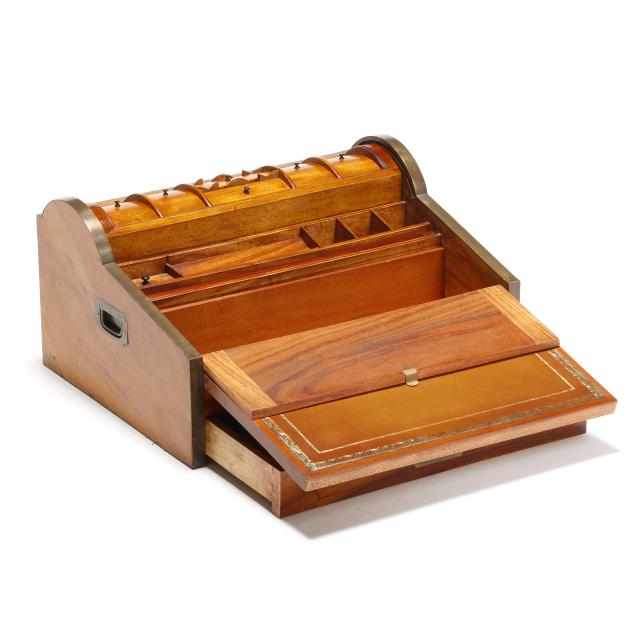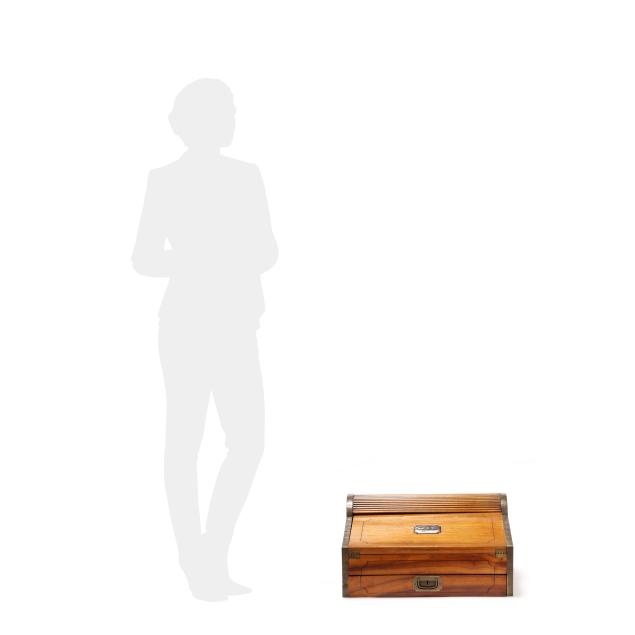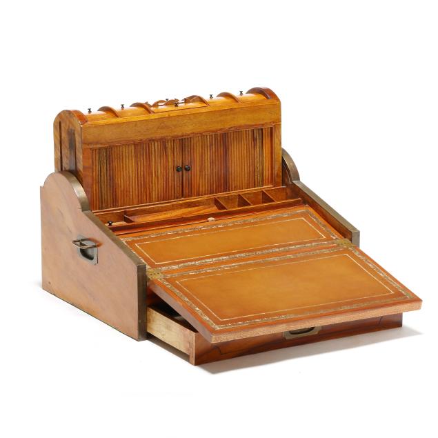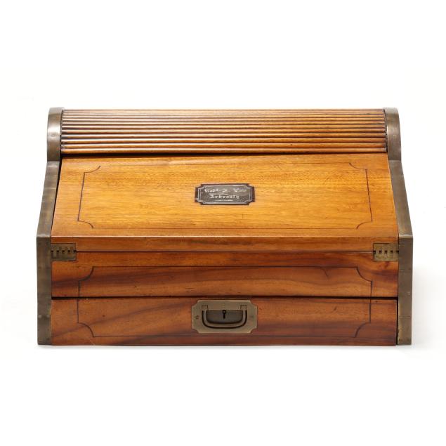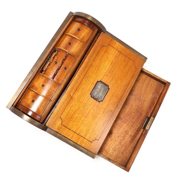 Late 19th century, brass mounted with dual side handles and tambour top, the silvered escutcheon engraved with dedication to "Rob.t F. Low / Arbroath" opening to a tan gilt leather writing service, featuring a lower drawer that activates the tambour top, opening to a divided interior with lidded compartments and removable central mirror, interior retaining some provenance and repair documents, with key.