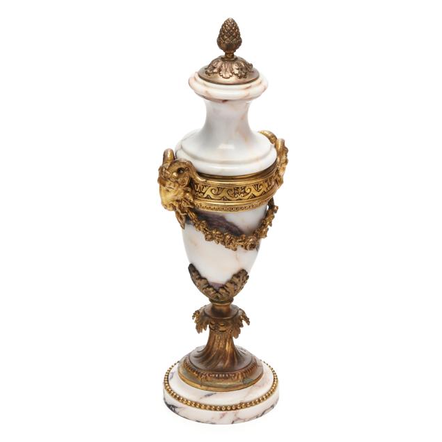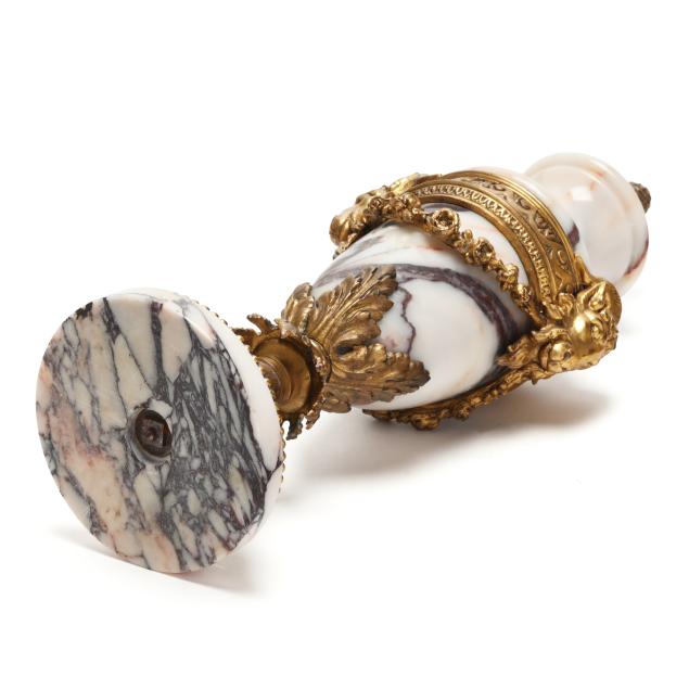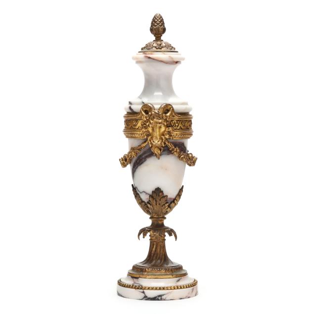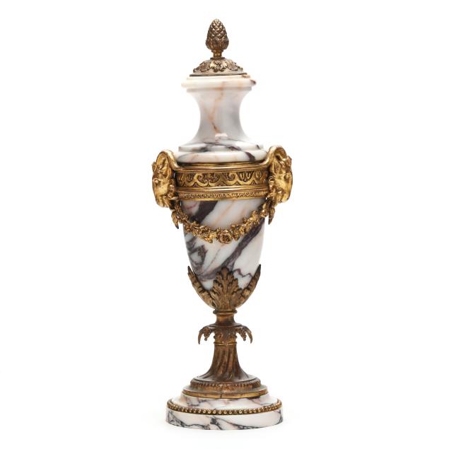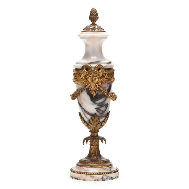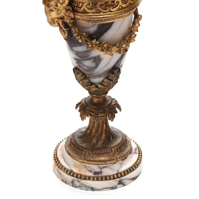 Late 19th century, a marble urn with purple and orange veining, ormolu mounts with ram's heads, floral swag, spreading acanthus leaves and grape vines to pedestal, beading to base, and an artichoke form finial, unmarked.