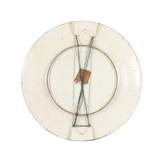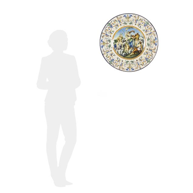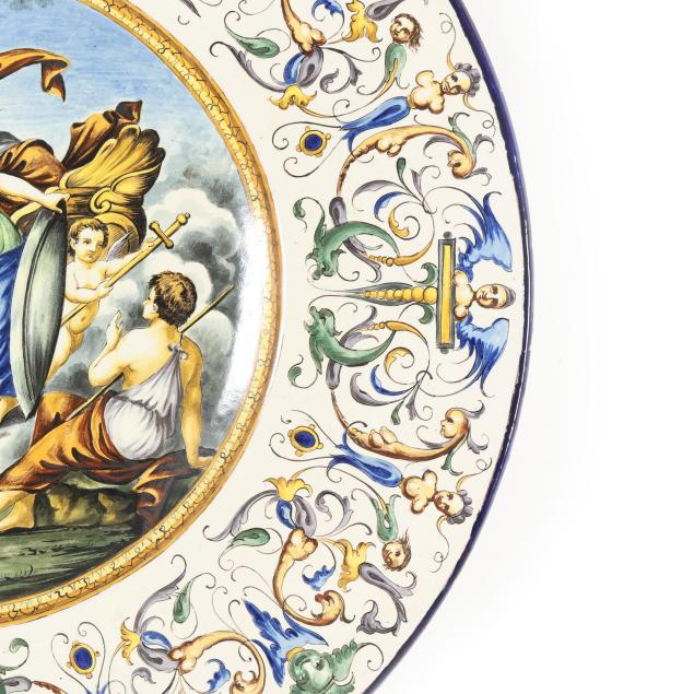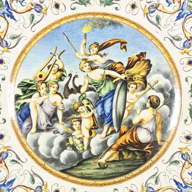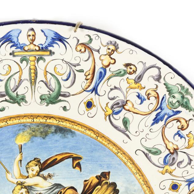 Late 19th to early 20th century, manner of Giovanni Mollica family, hand-painted tin-glazed earthenware, unsigned, the dynamic mythological scene depicting various figures including Juno (Hera) and her chariot, the underside foot center retaining a partial worn label.