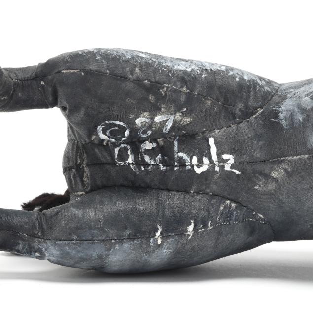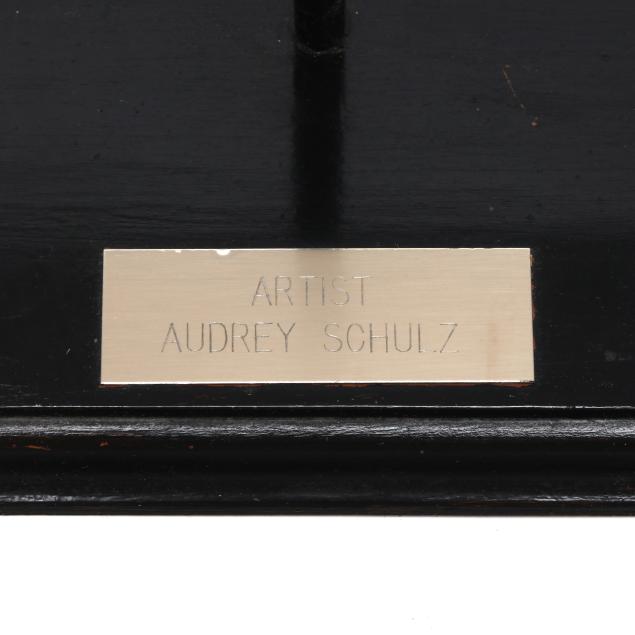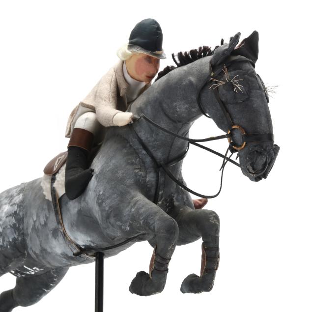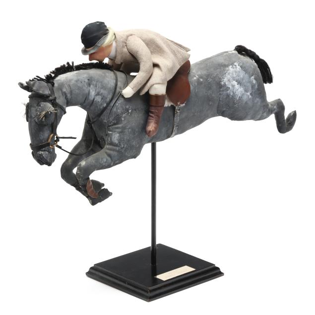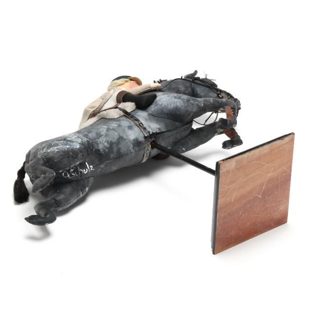 Kentucky, 1987, a mixed media soft sculpture with cloth, yarn, leather, and wool mounted to an ebonized wood stand, plaque to stand reads "ARTIST / AUDREY SCHULZ", sculpture signed and dated to underside of horse.