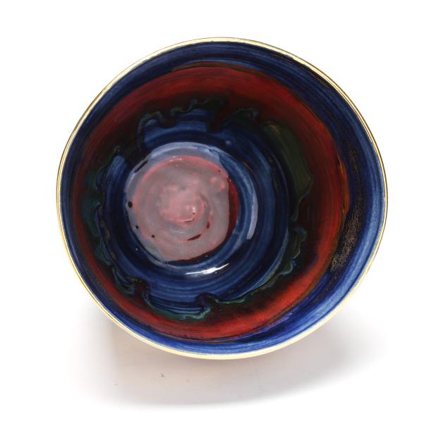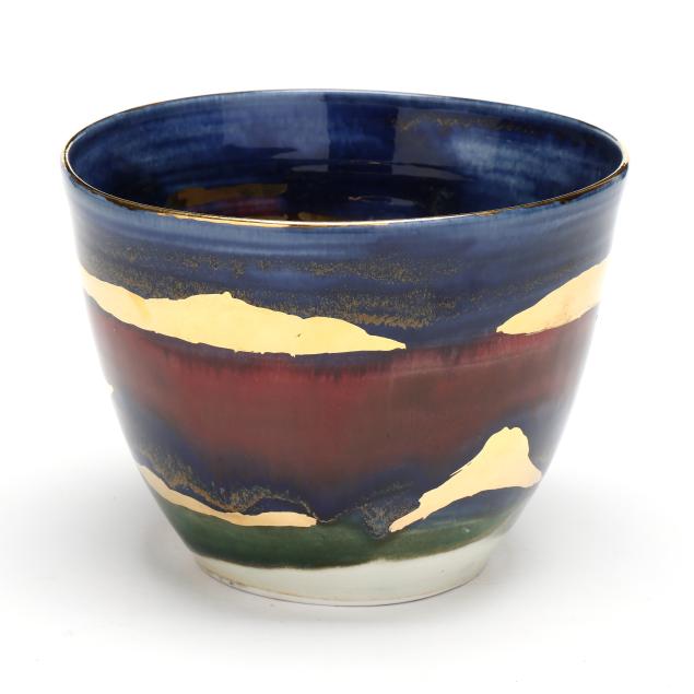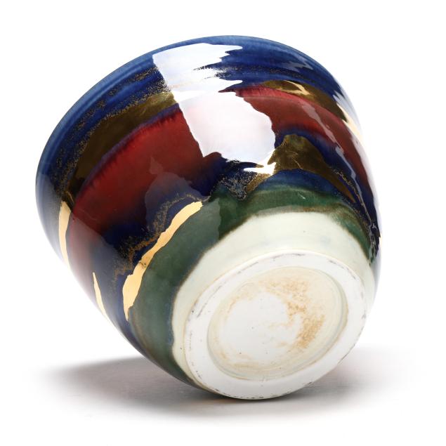 Late 20th century, thrown porcelain bowl with red and blue glazes and gilt luster accents, artist's stamp "SP" to underside.