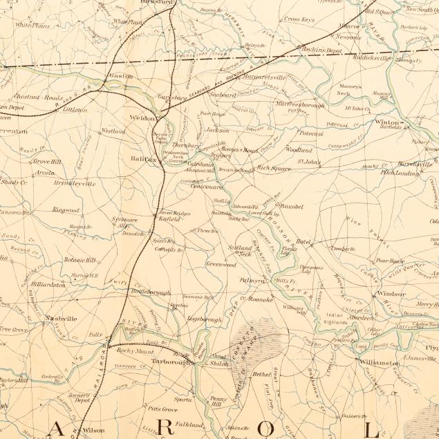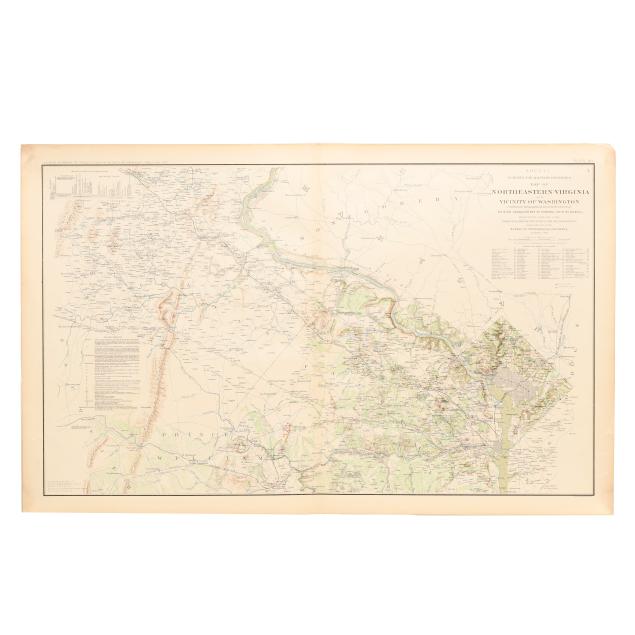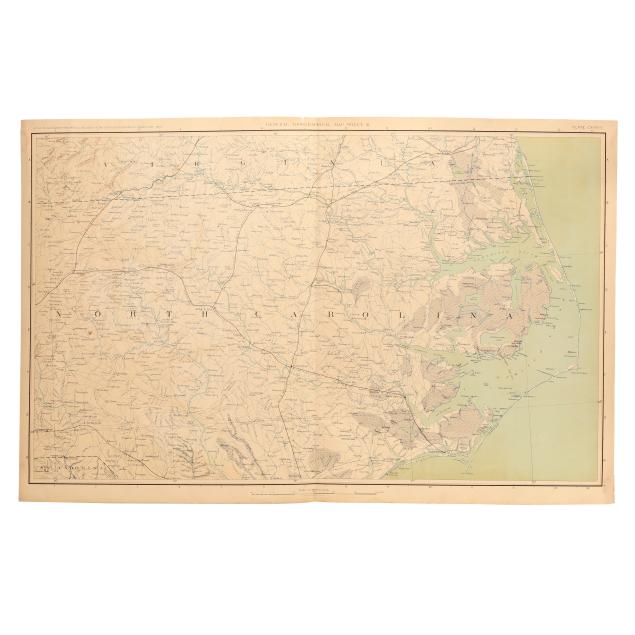 Atlas to Accompany the Official Records of the Union and Confederate Armies. 1861-1865. (Washington, 1891-1895). Lithographed by Julies Bien & Co., New York. Presenting a detailed map of North Carolina with parts of Virginia and South Carolina. (18 x 28 3/8 in.) (Toning, image transfer, minor creasing, rare spot of foxing (mostly to verso), and wear at margins including minor grime, a couple of subtle damp stains, some small chips and closed tears (a few impacting title), a small area of separation at the centerfold, and two professionally repaired tears.)