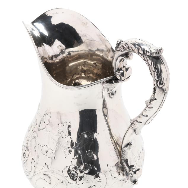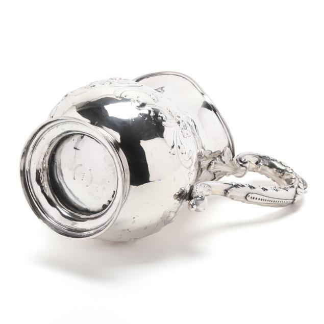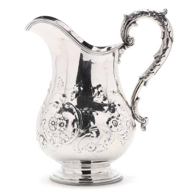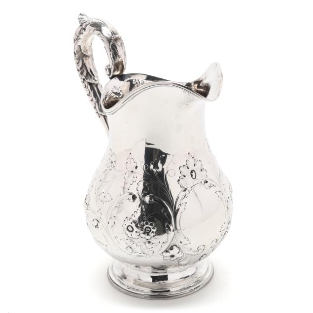 New York, circa 1851-1872, featuring hand-chased floral repousse to the body, a scrolled rocaille handle, reeded rim and pedestal foot, not monogrammed.