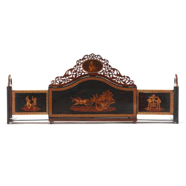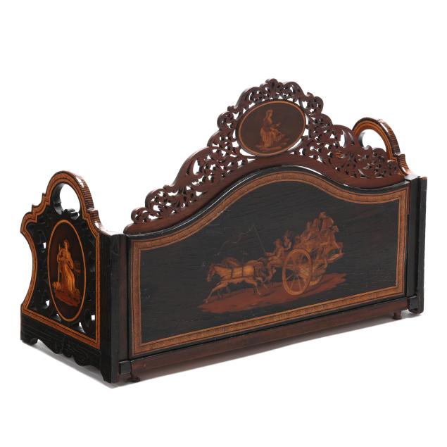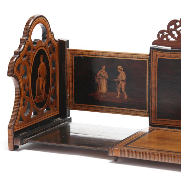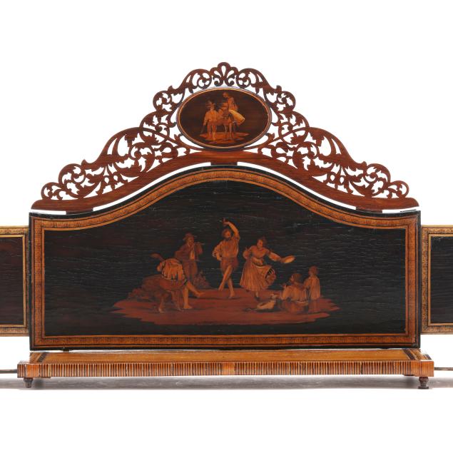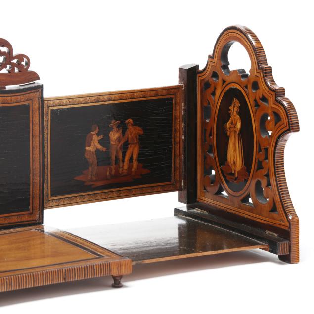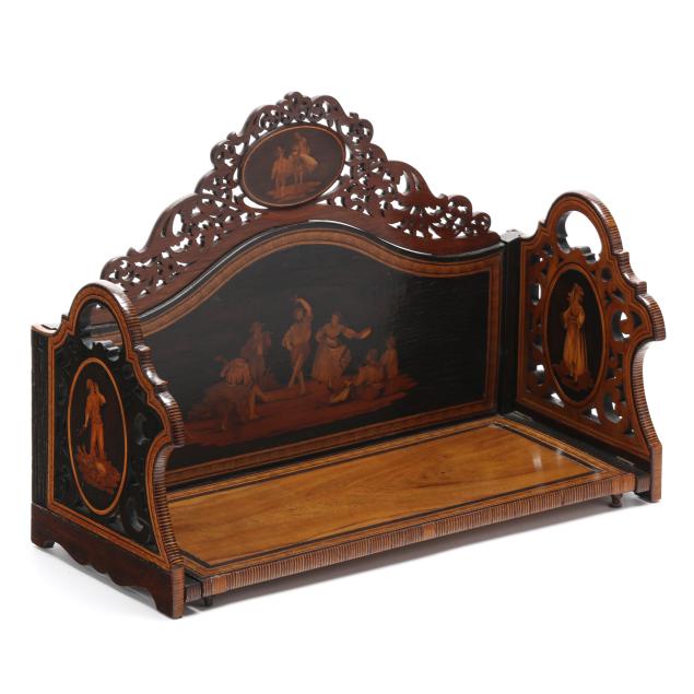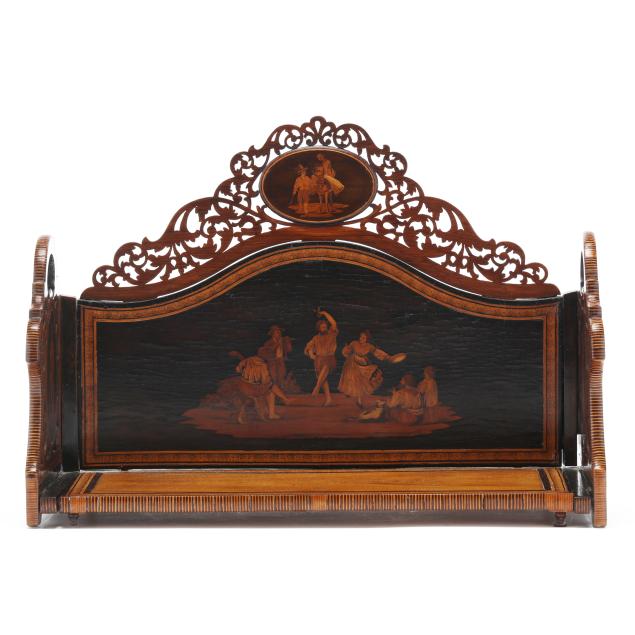 Late 19th century, mixed woods, unsigned, serpentine back with inlaid scene of merry gypsy dancers flanked by oval figural and genre scenes to the pierced pediment as well as the dovetailed and hinged sides, sides expanding with further conforming inlaid decoration.