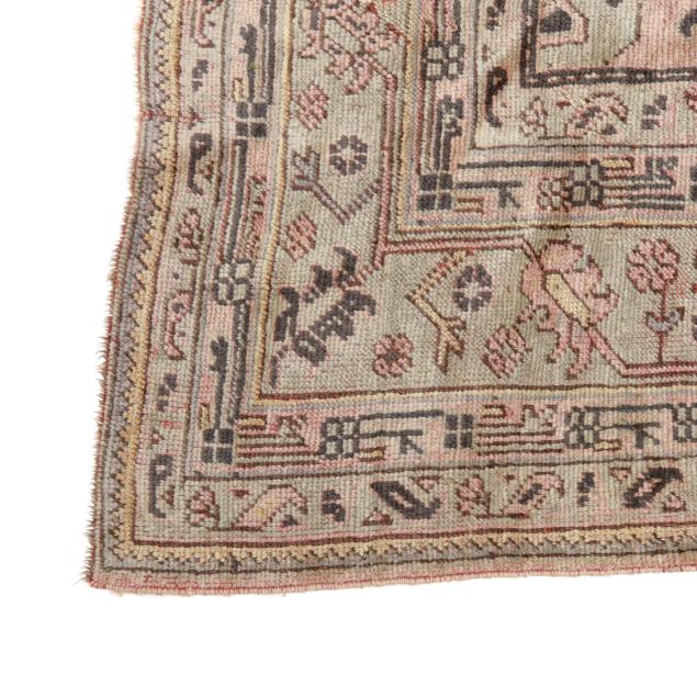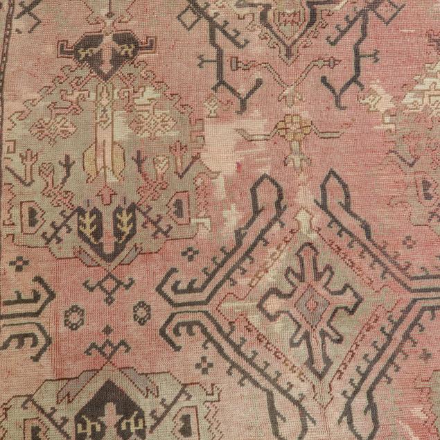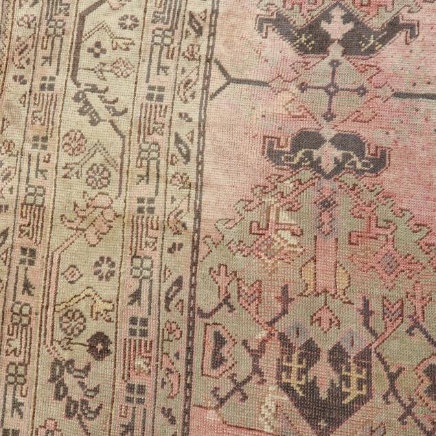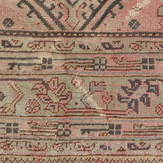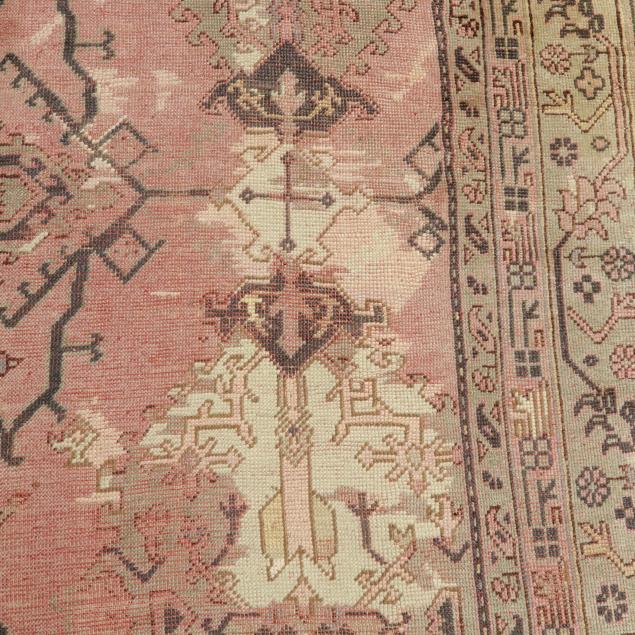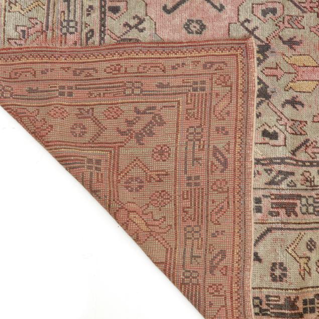 Wool on brown wool foundation, the very loosely knotted carpet featuring a pale pink field with light blue and tan repeating medallion-shaped motifs, the main pale blue border with repeating large-scale floral and foliate motifs, within multiple minor borders.