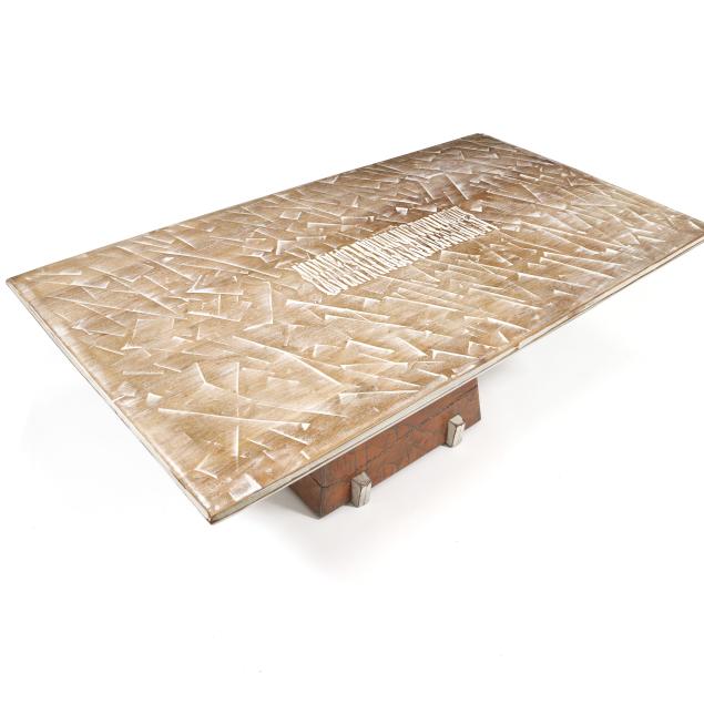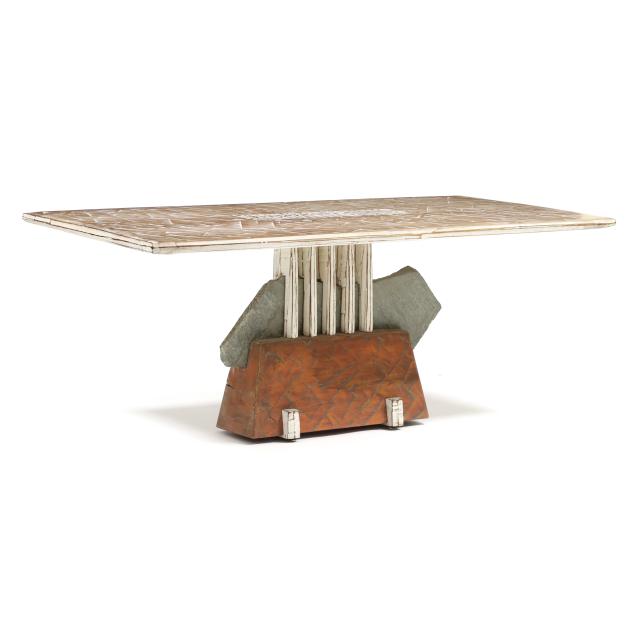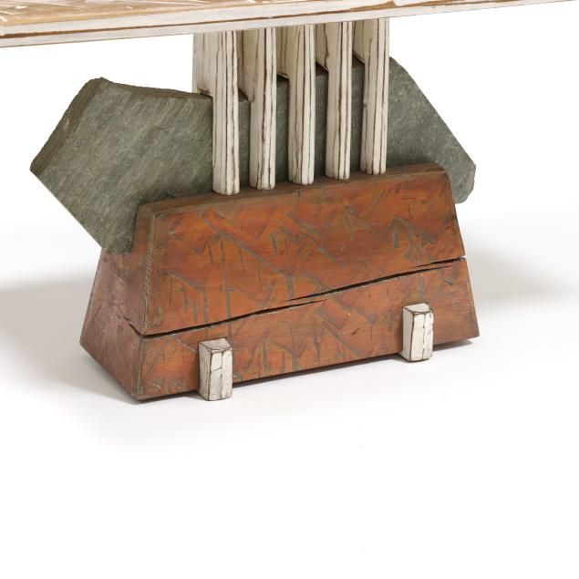 1990, rectangular top with rough hewn surface and white washed finish, central grooved panel, the pedestal with slate stone encased in hewn wood with white and red wash, trestle form foot, signed.