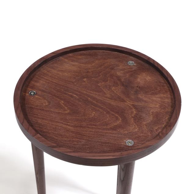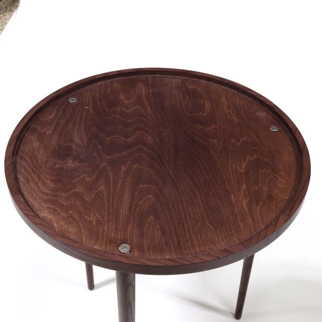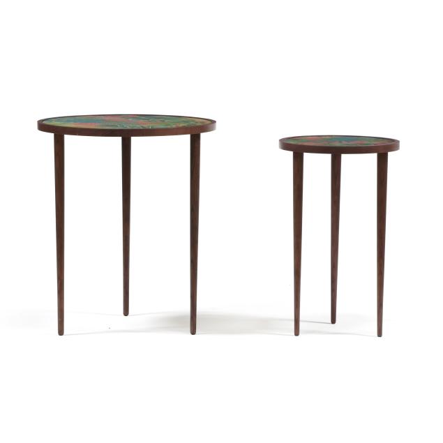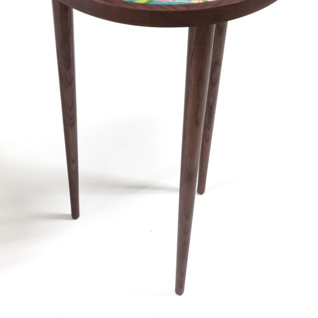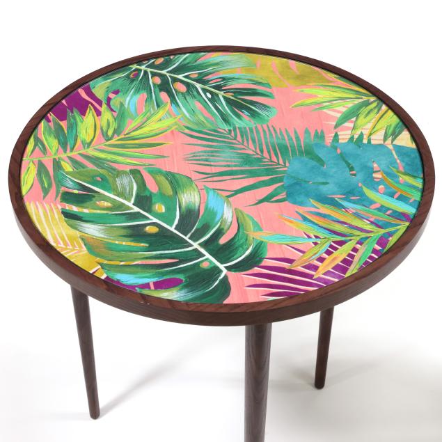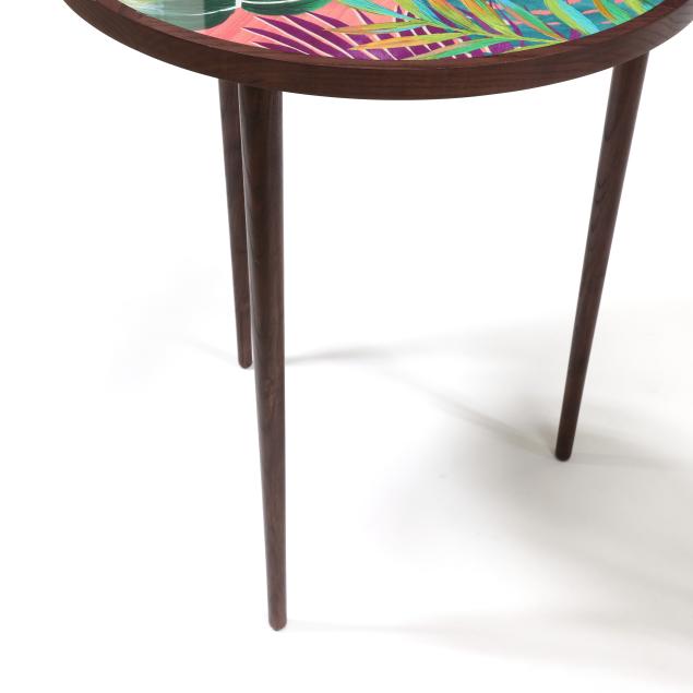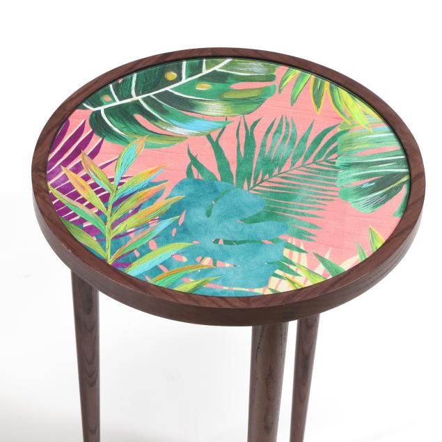 Roome London Allegra line, ash wood with tropical fabric covered circular tops and inset glass surface, turned tapered legs, unmarked.