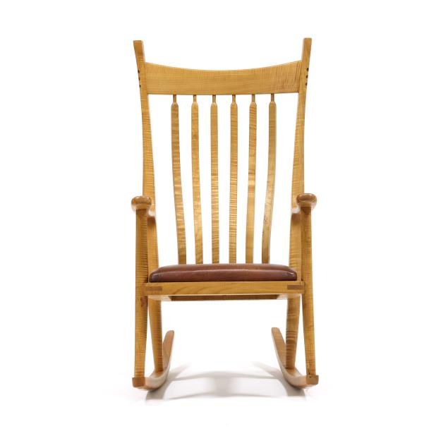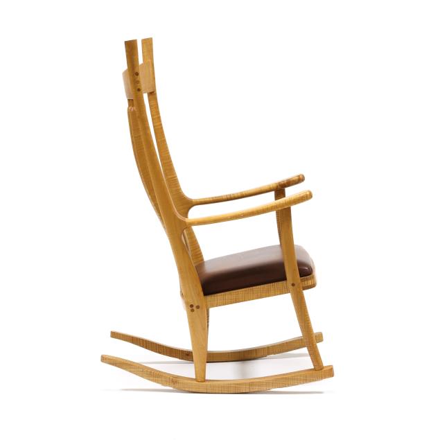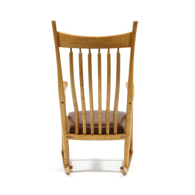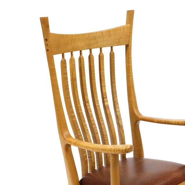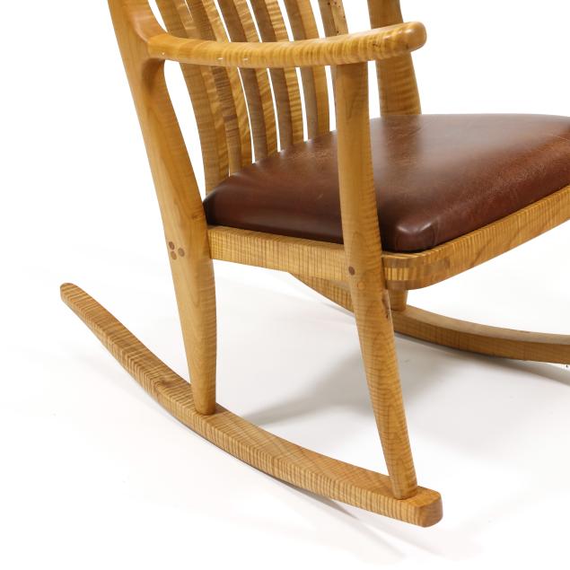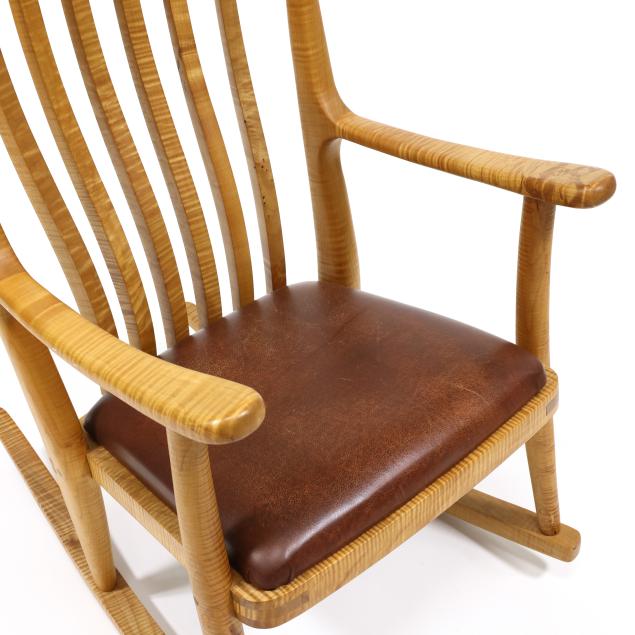 Late 20th century, figured maple, brown leather seat, marked to underside.
