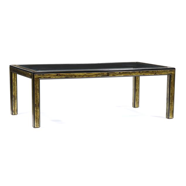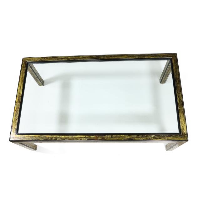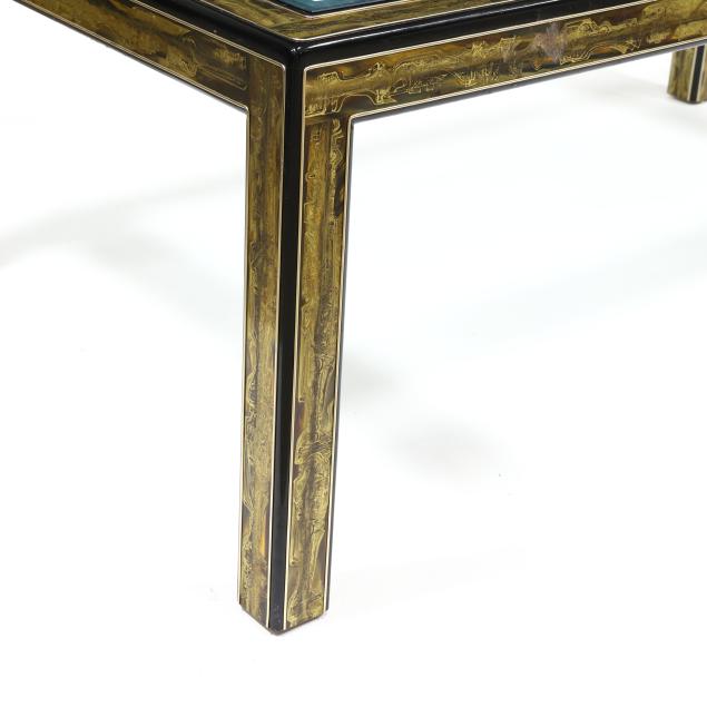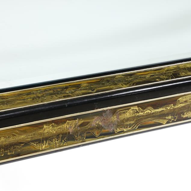 Circa 1970, abstract acid etched brass with patinated surface, smoky beveled glass top, black lacquered edges, four straight legs, unmarked.