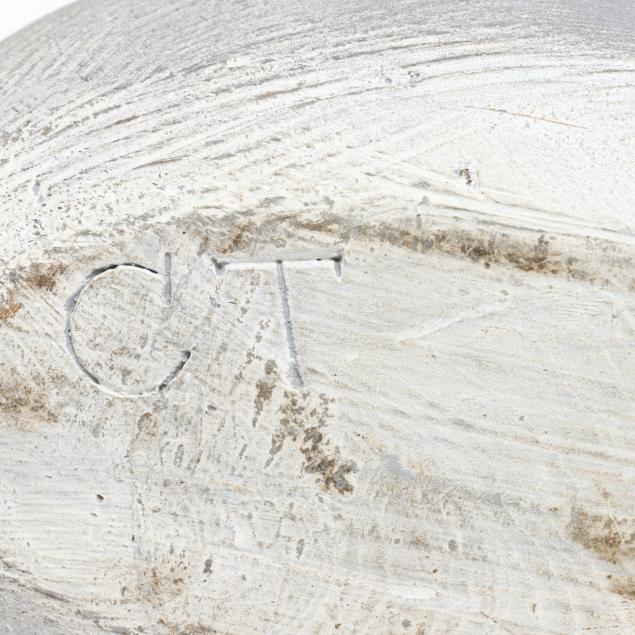 Circa 1950s, carved and painted wood, glass eyes, branded CT.