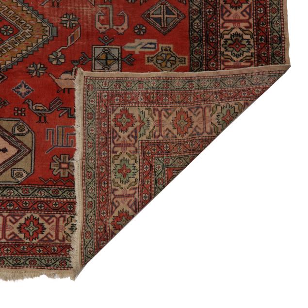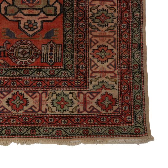 Wool on cotton foundation, the salmon pink field with central cream medallion filled with geometric, floral, and avian motifs, the field filled with detached comb, geometric, avian, and stylized floral motifs, the main taupe border with repeating stylized florettes between minor floral borders.