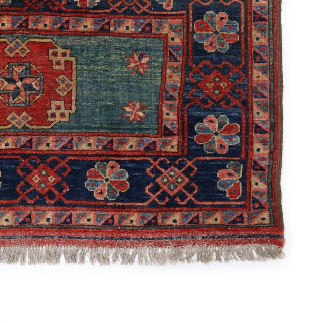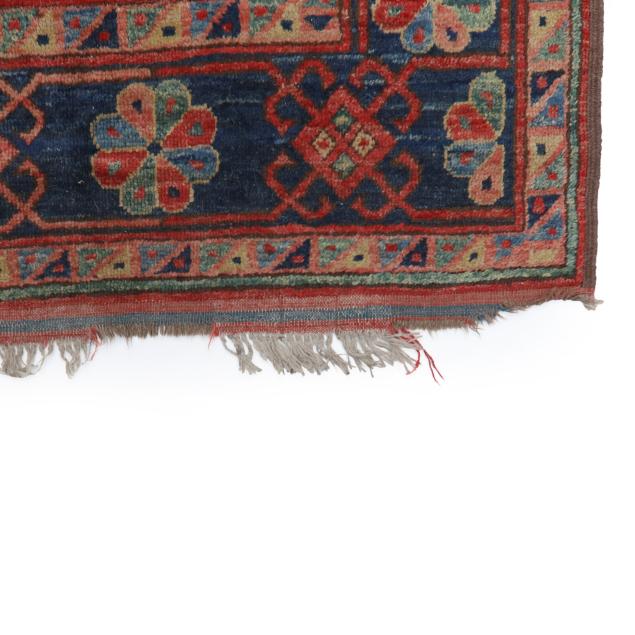 Wool on gray wool foundation, the main red rectangular field with center latched octagonal medallion surrounded by geometric motifs, with green rectangular minor fields to each end, filled with geometric motifs, the main blue border with repeating stylized florette motifs, within geometric borders, with triple corded selvages and striped flatweave to either end..