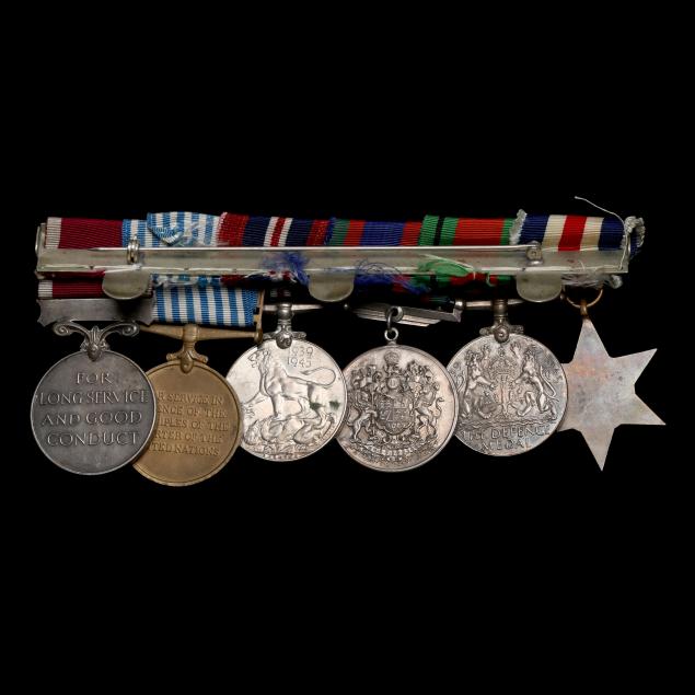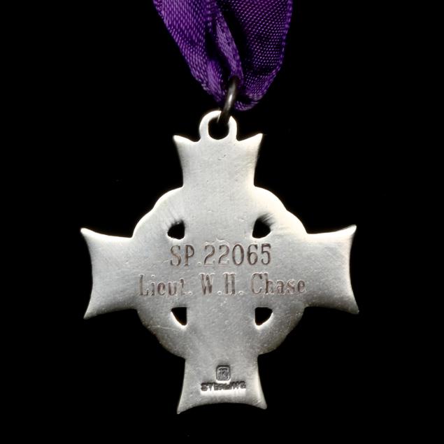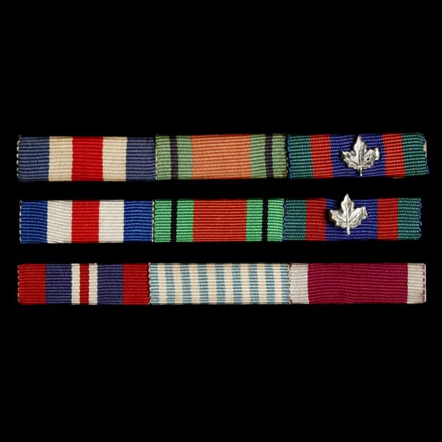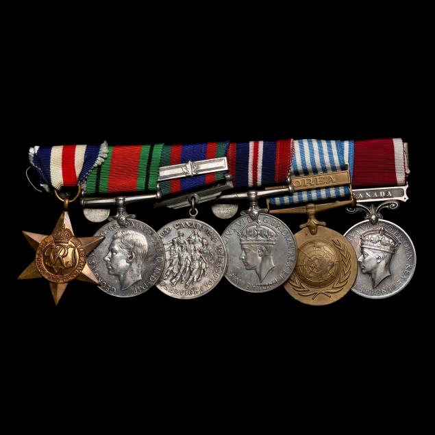 To include: A sterling silver Canadian Memorial Cross with purple ribbon honoring Lieut. W. H. Chase; The France and Germany Star; The Defense Medal, 1939-1945; Canada Voluntary Military Service,1939-1945; Canadian Service Medal; United Nations, Korean Service Medal; Canadian Good Conduct Medal. Included are three bars representing the medals above.