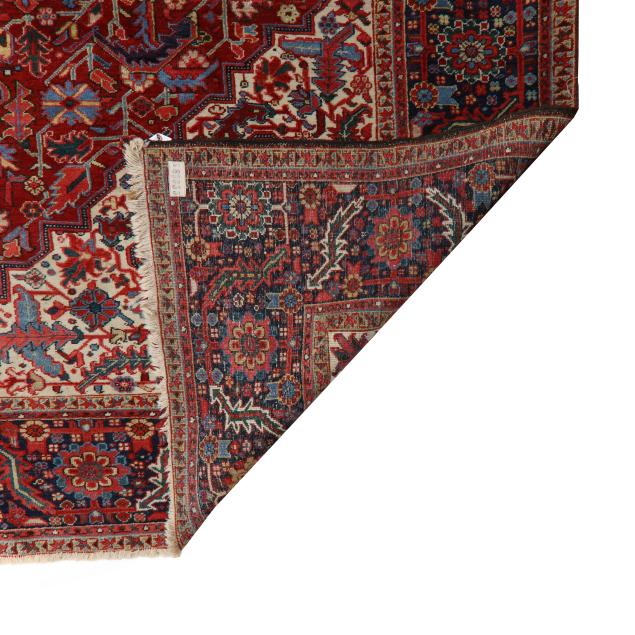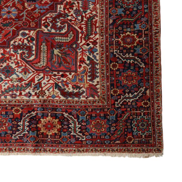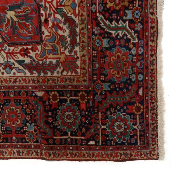 Wool on cotton foundation, the red field with large multicolored poled medallion, the cream spandrels with multicolored floral and foliate motifs, the wide navy border with repeating floral and foliate motifs, within minor borders.