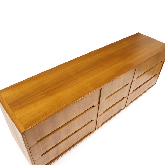 Circa 1980, low rectangular form with rounded corners, nine drawers, recessed flush base, finished back, appears unmarked.