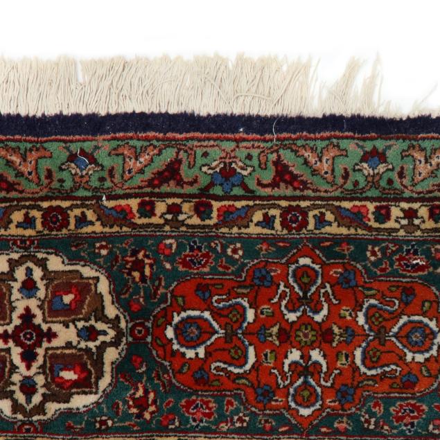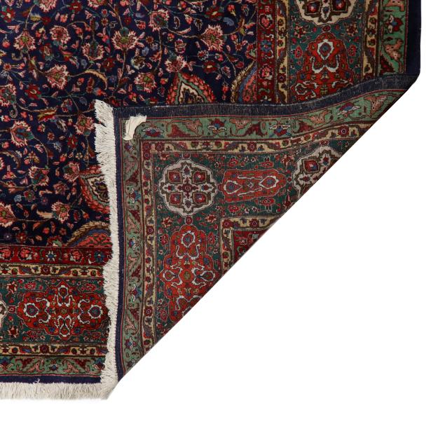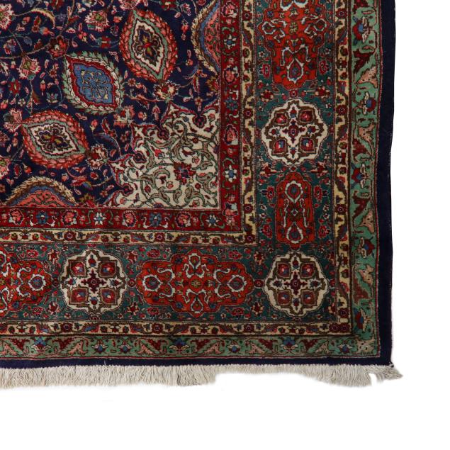 Wool on cotton foundation, the midnight blue field with central round medallion surrounded by multicolored lozenge motifs, with censer motif to each side of medallion, the field with scrolling lattice of palmette motifs, the spandrels with the same lozenge motifs, the main dark green border with orange and cream decorative cartouches, within minor foliate borders.