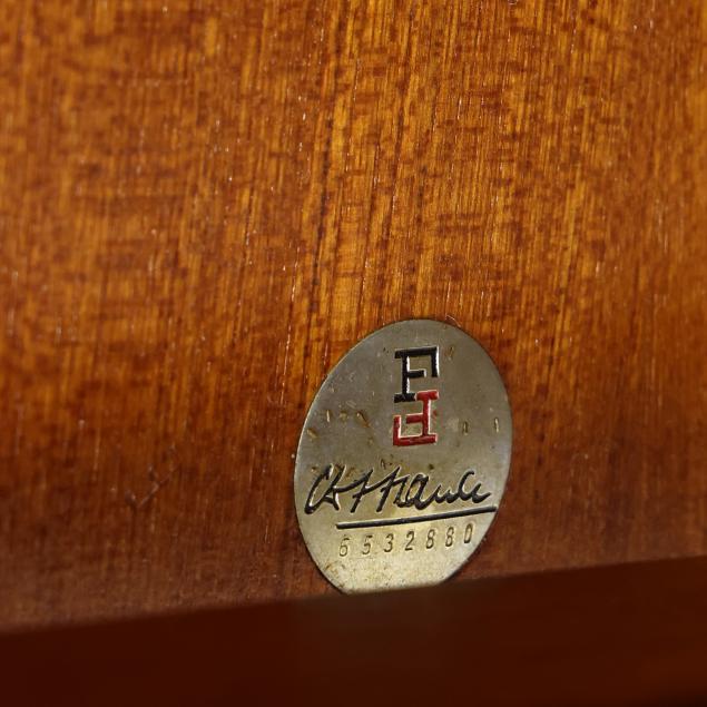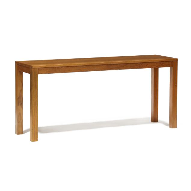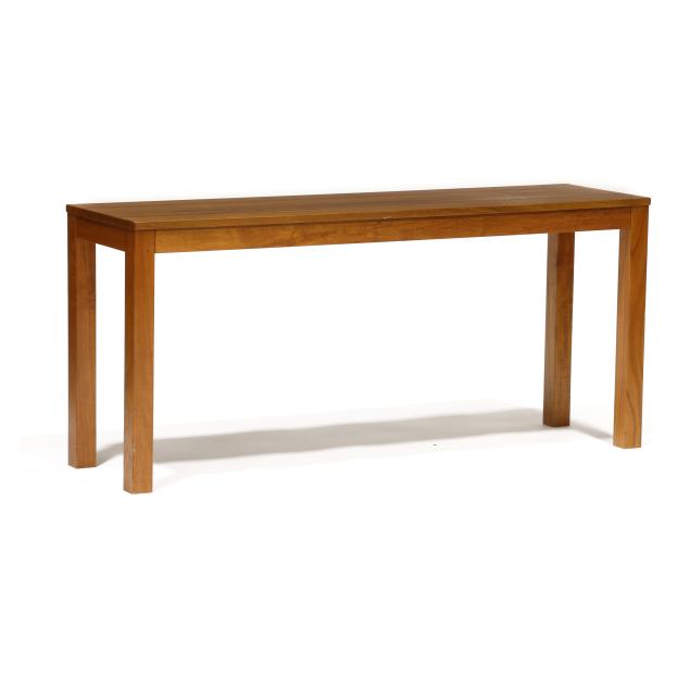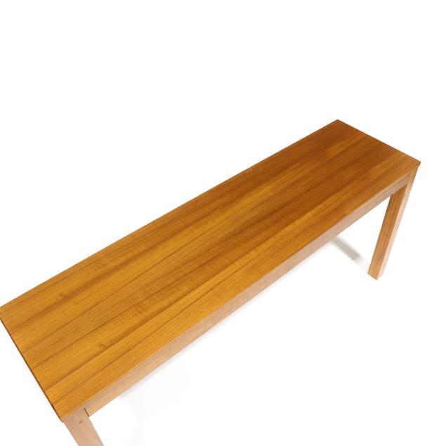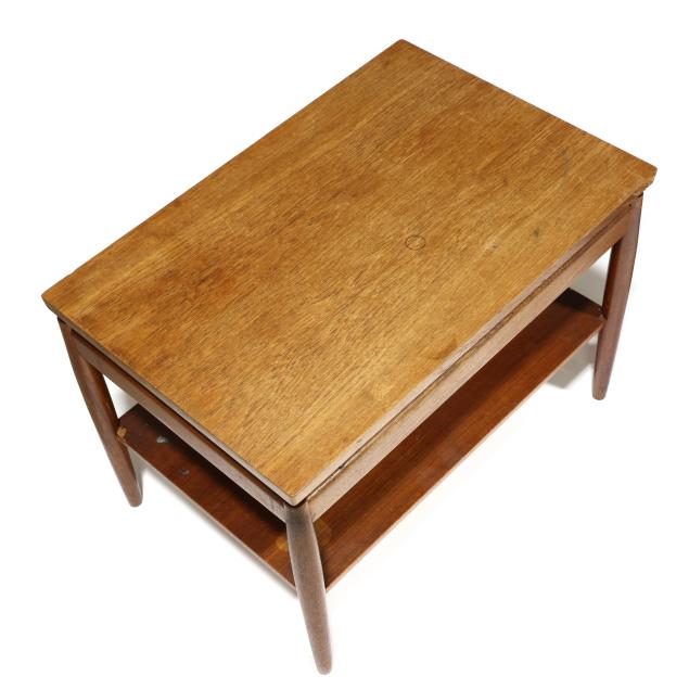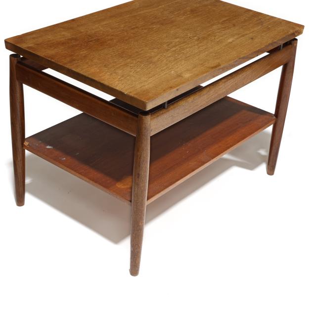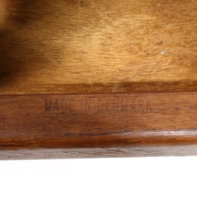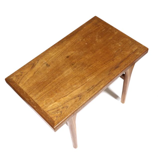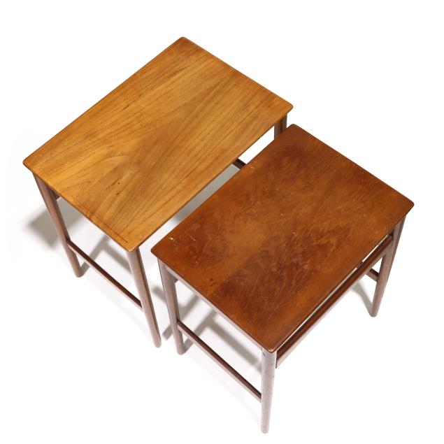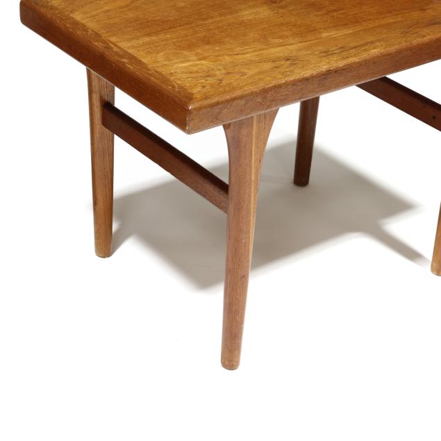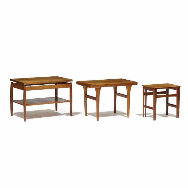 Circa 1970-80, teak and teak veneer, including a sofa/console table (26 x 58 x 16 in.), marked Trioh; a "floating top" side table with lower shelf (21 x 29.5 x 19.5 in.), labeled France and Son; a nest of two side tables (larger 18.25 x 18 x 12.25 in.), marked Hans Wegner for Andreas Tuck; and a rectangular side table with tapered legs and upper stretcher support (20 x 30 x 17.25 in.), stamped Made in Denmark.