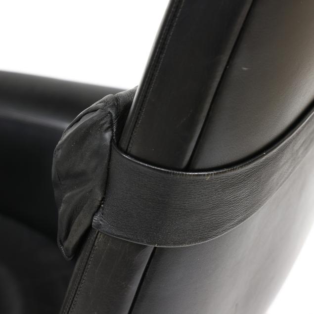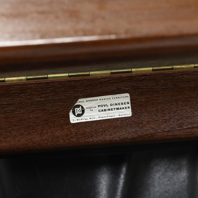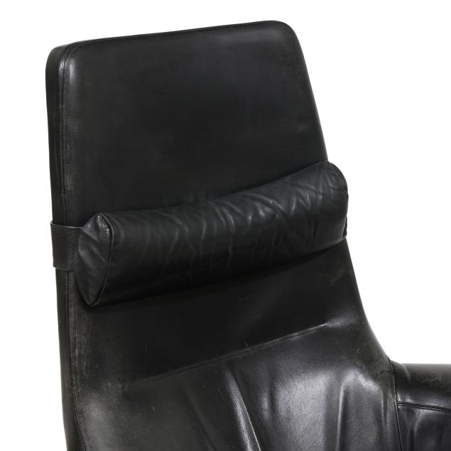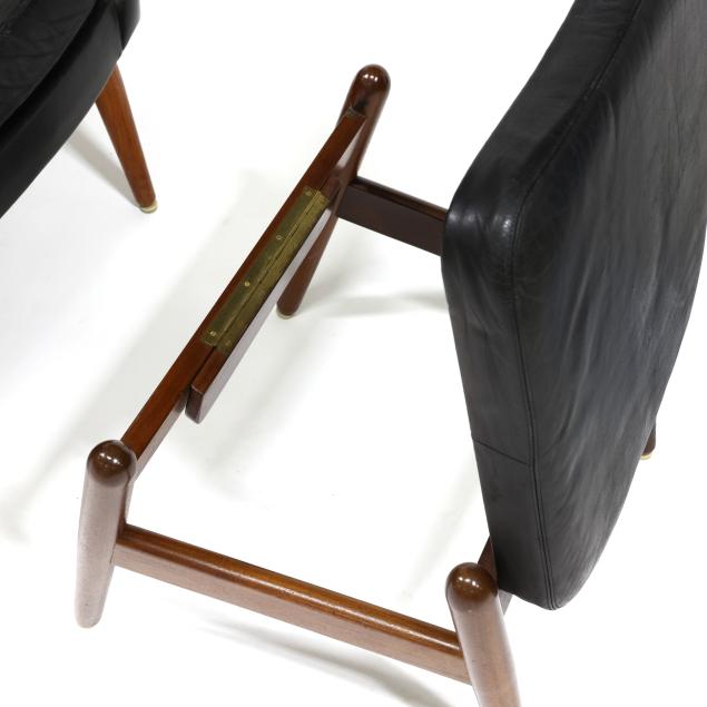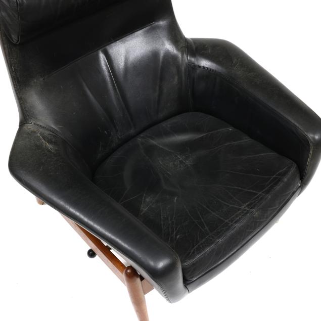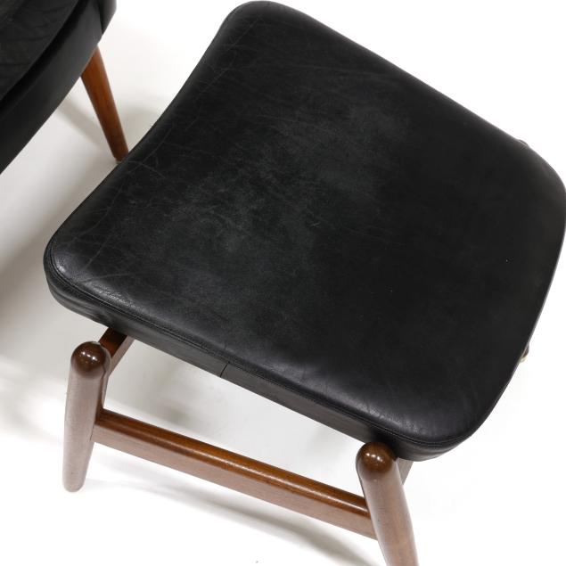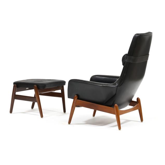 Circa 1960, for Povl Dinesen, black leather chair with head pillow, adjustable rocking platform, turned tapered teak legs together with conforming ottoman with hinged lift to one end, labeled.