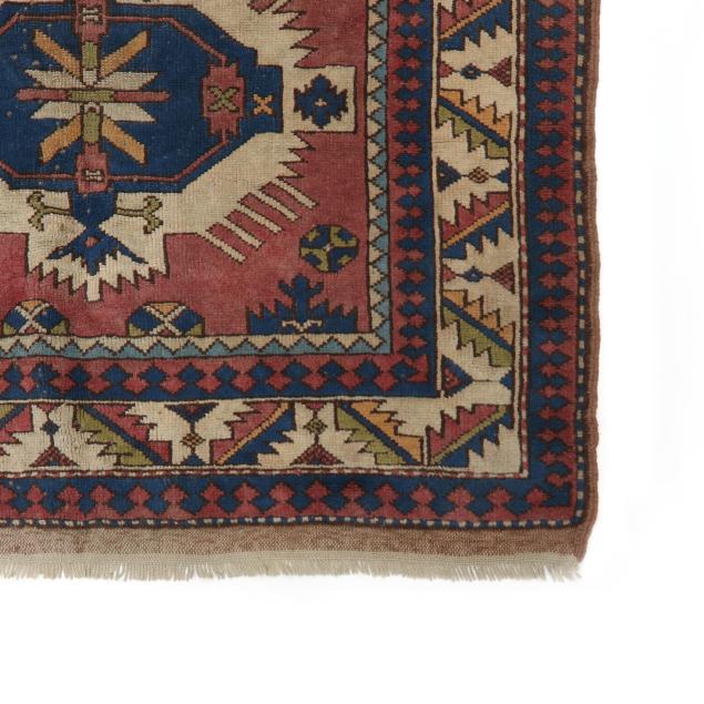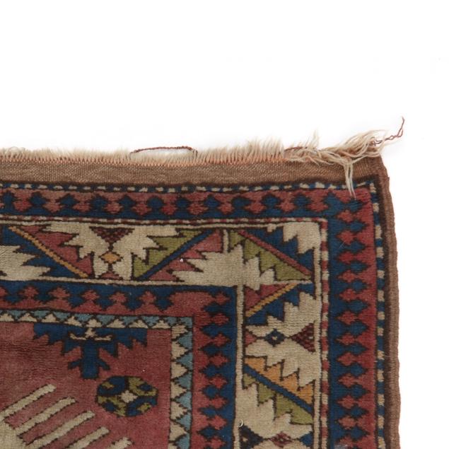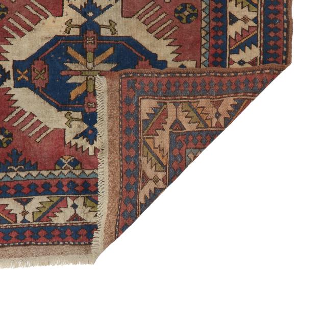 Wool on wool foundation, the burgundy field with three repeating geometric medallions surrounded by geometric motifs, the main cream border with multicolored serrated leaf motifs, within minor reciprocal borders, the ends with flatweave and twisted looped fringe to one end, open fringe to other end.