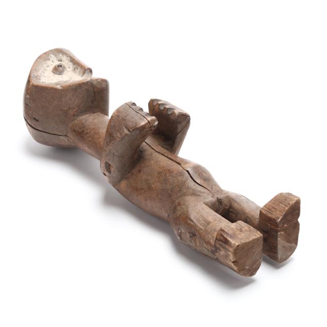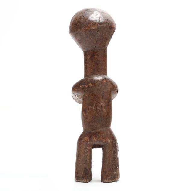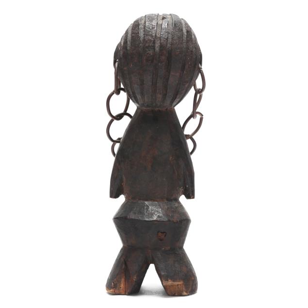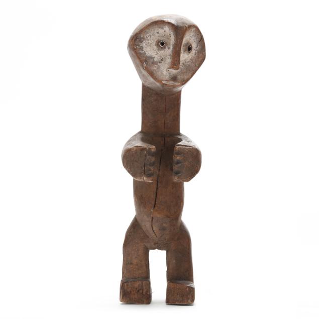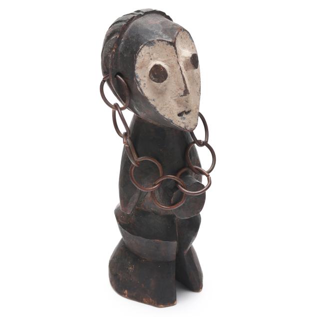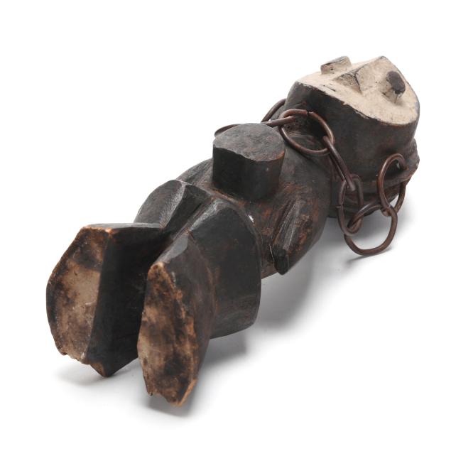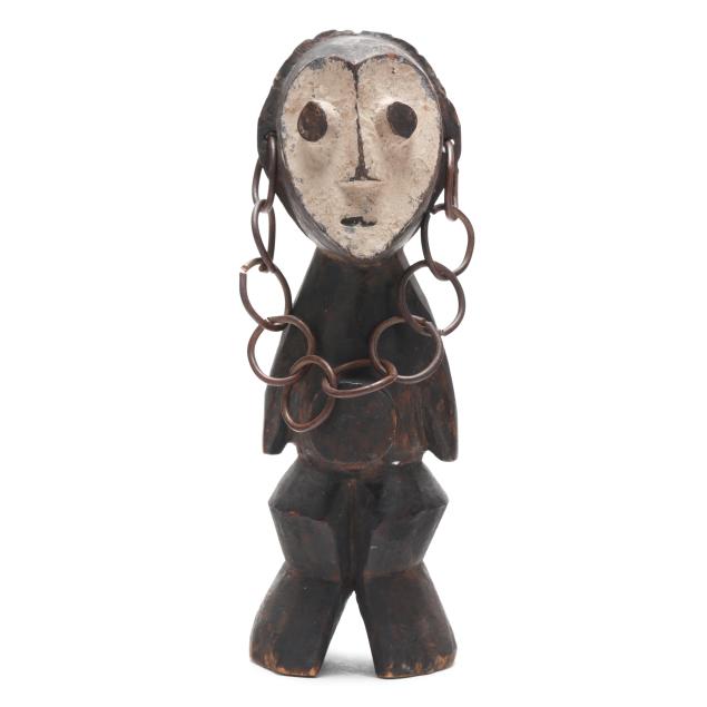 Both likely by the Lega peoples, Democratic Republic of the Congo, early to mid- 20th century, carved wood, possibly iginga figures significant to Bwami cultural hierarchy, the first with arms outstretched and kaolin applied surrounding eyes (11 x 3 1/8 x 3 1/4 in.); the second with kaolin applied to face, with protruding belly, stylized hair, and a chain affixed to both ears (8 x 2 5/8 x 2 7/8 in.).