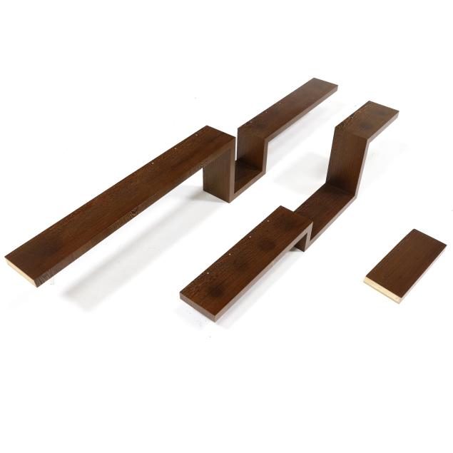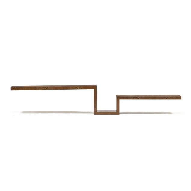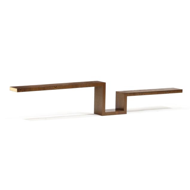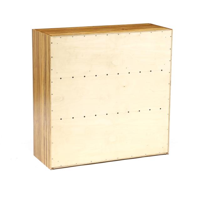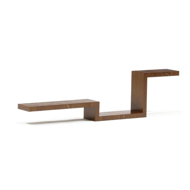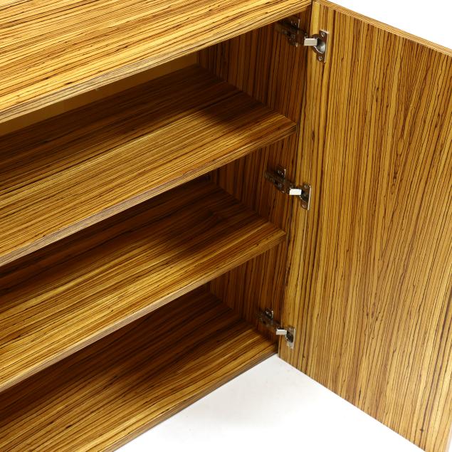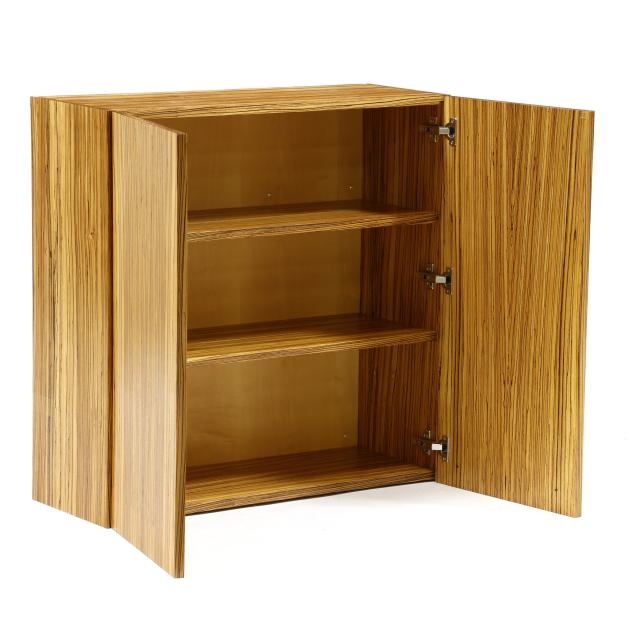 Contemporary, high grade exotic wood veneers, including a two door cabinet with shelved interior (33 x 32.75 x 12.75 in.); and three wall mount shelves (the longest (14 x 82.25 x 6.75 in.), unmarked.