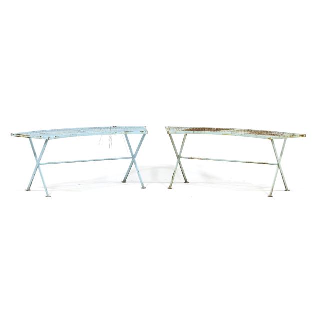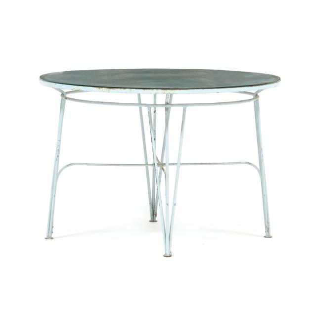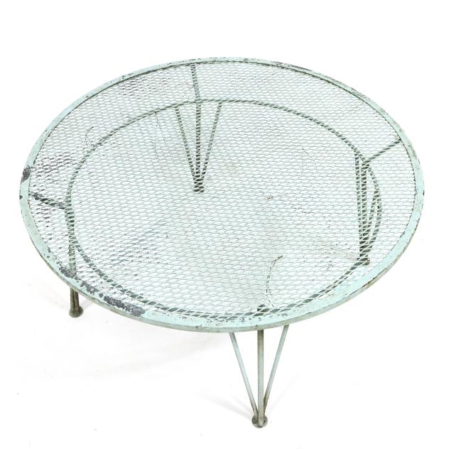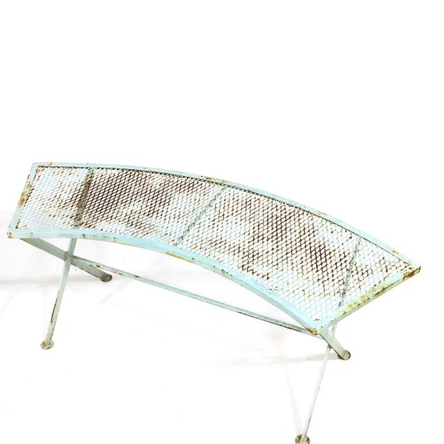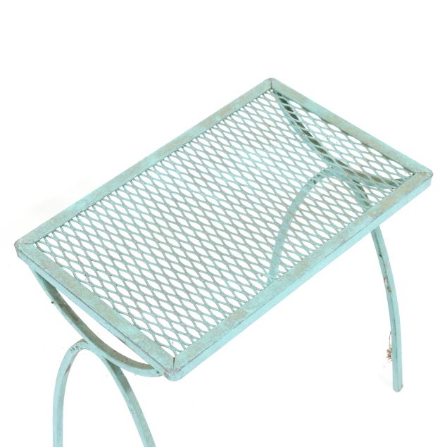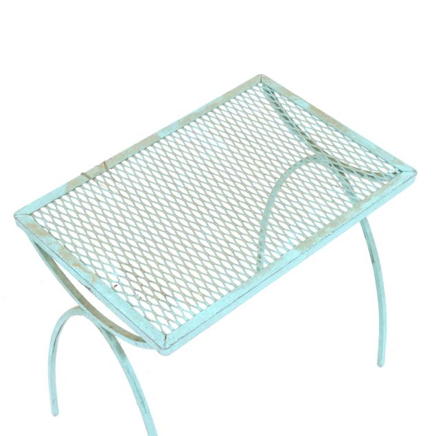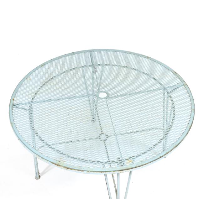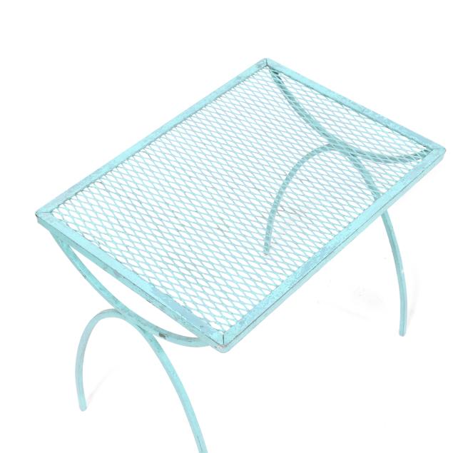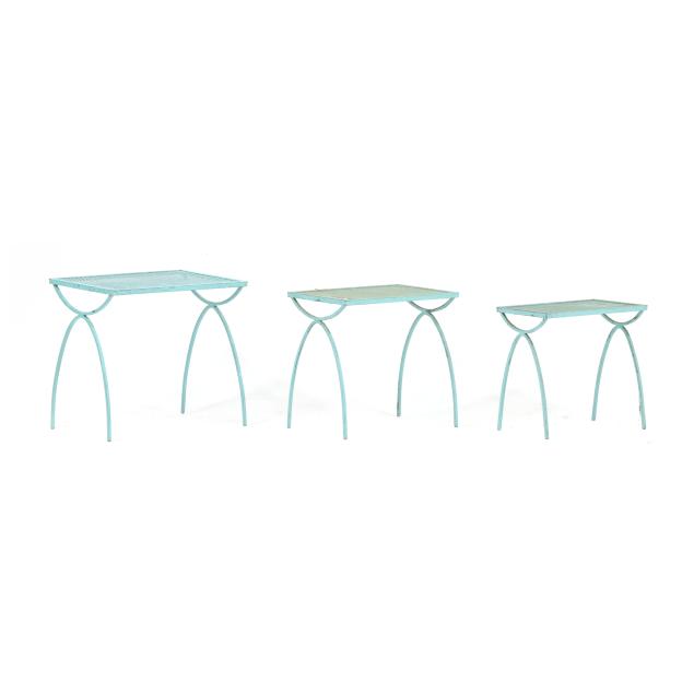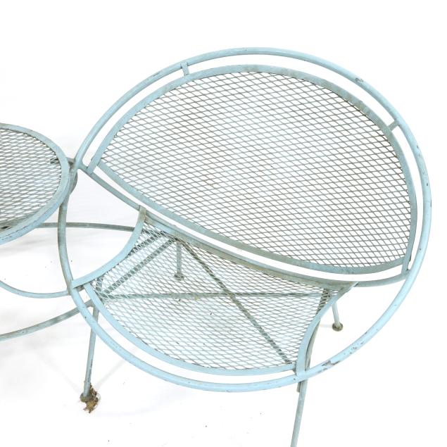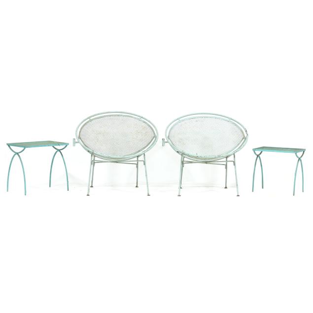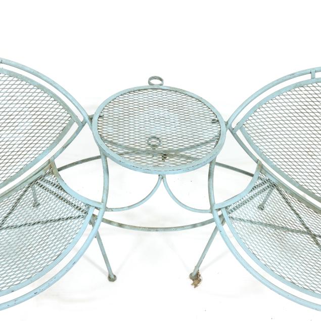 Circa 1950 for John Salterini, light green painted iron, including a rare double seat form with central circular stand and umbrella receptacle (27.5 x 69 x 30 in.); pair of chairs with side receptacle (28 x 30 x 25 in.); a pair of cantilevered chairs (30 x 30 x 25 in.); a nest of three rectangular side tables (largest 19 x 20.5 x 14.5 in.); pair of circular cocktail tables (18.5 x 36 in. diameter); pair of curved benches (17.75 x 46 x 14 in.); and a circular bistro table with central umbrella receptacle (28 x 42 in. diameter), unmarked.