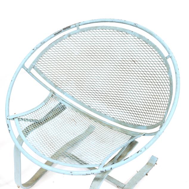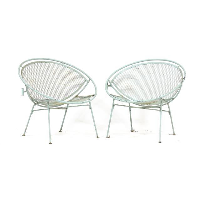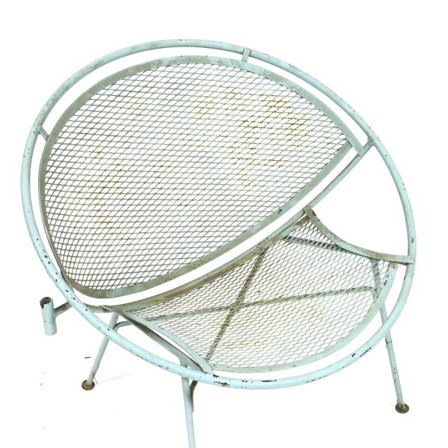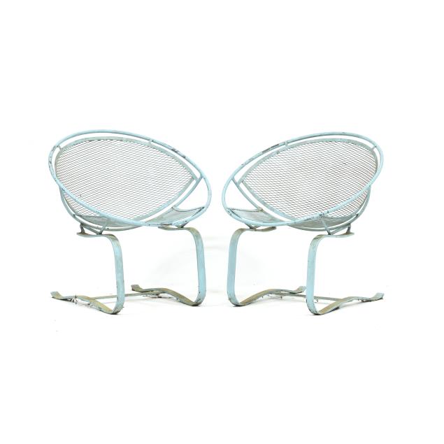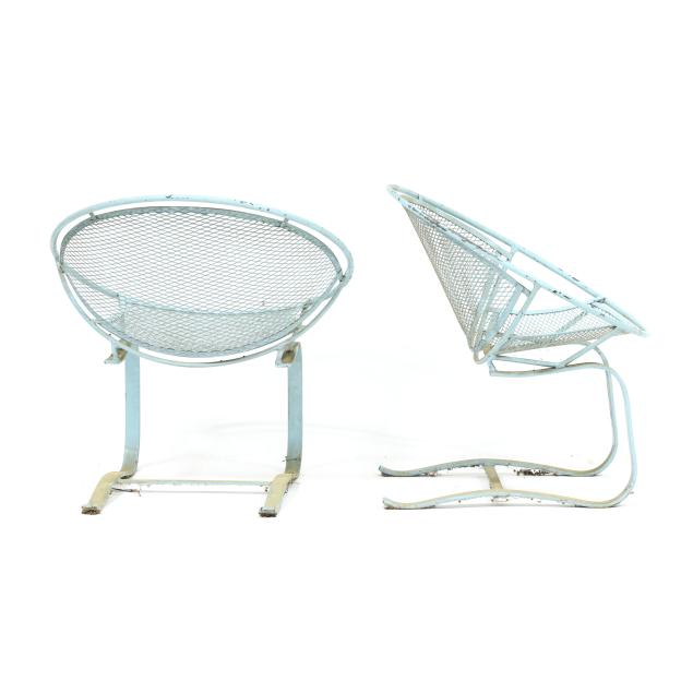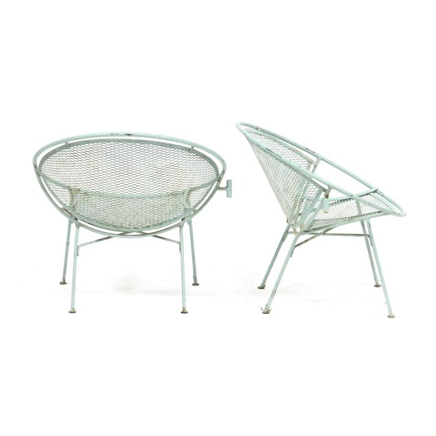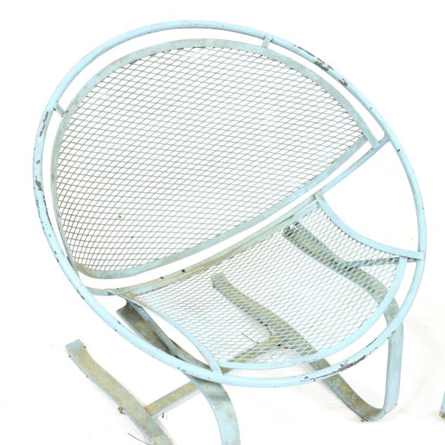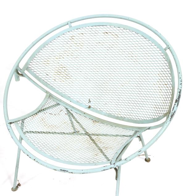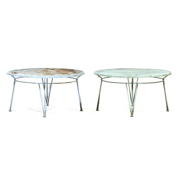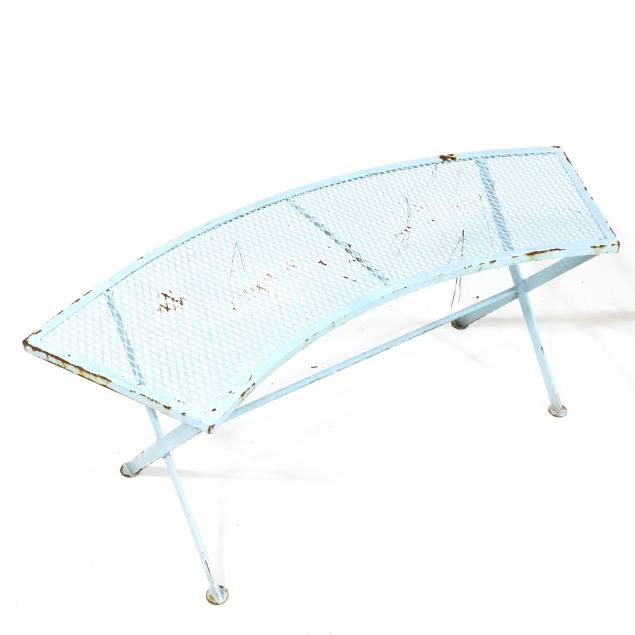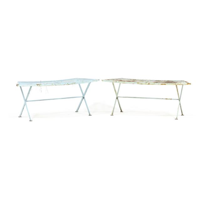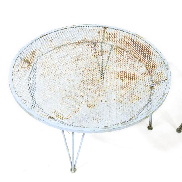 Circa 1950 for John Salterini, light green painted iron, including a rare double seat form with central circular stand and umbrella receptacle (27.5 x 69 x 30 in.); pair of chairs with side receptacle (28 x 30 x 25 in.); a pair of cantilevered chairs (30 x 30 x 25 in.); a nest of three rectangular side tables (largest 19 x 20.5 x 14.5 in.); pair of circular cocktail tables (18.5 x 36 in. diameter); pair of curved benches (17.75 x 46 x 14 in.); and a circular bistro table with central umbrella receptacle (28 x 42 in. diameter), unmarked.