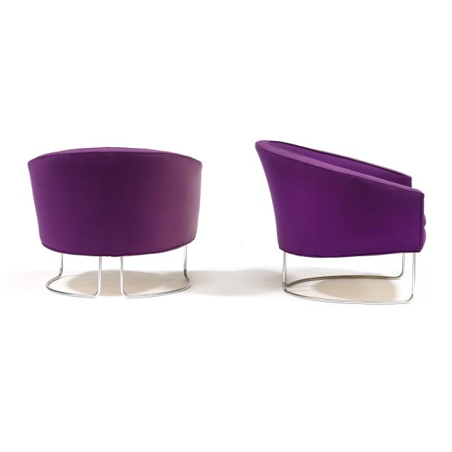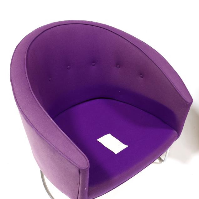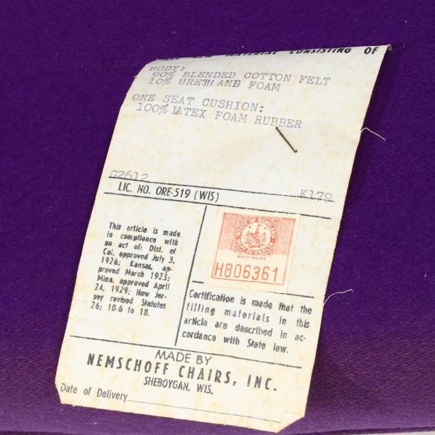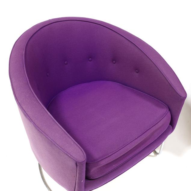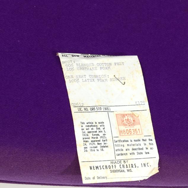 Circa 1960, labeled Memschoff Chairs, Inc., purple upholstery with loose seat cushion, conforming curved rod leg base.