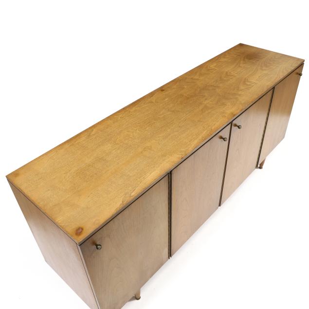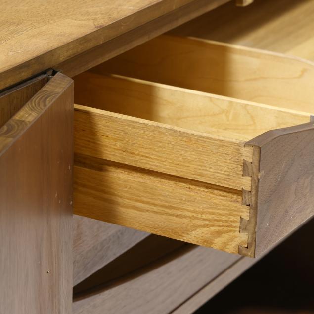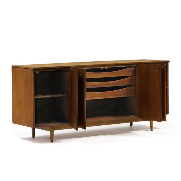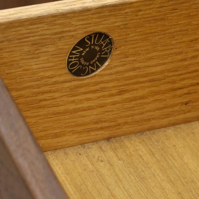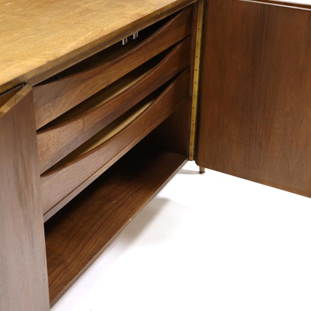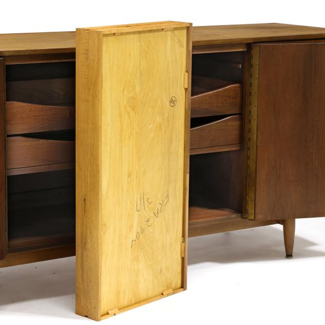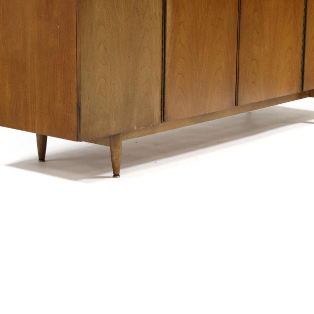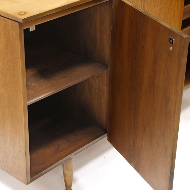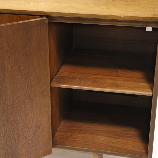 Circa 1960, walnut veneer, four hinged doors, divided interior with three fitted drawers and two shelves, turned tapered legs, labeled.