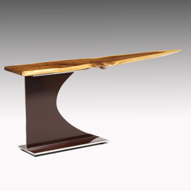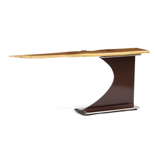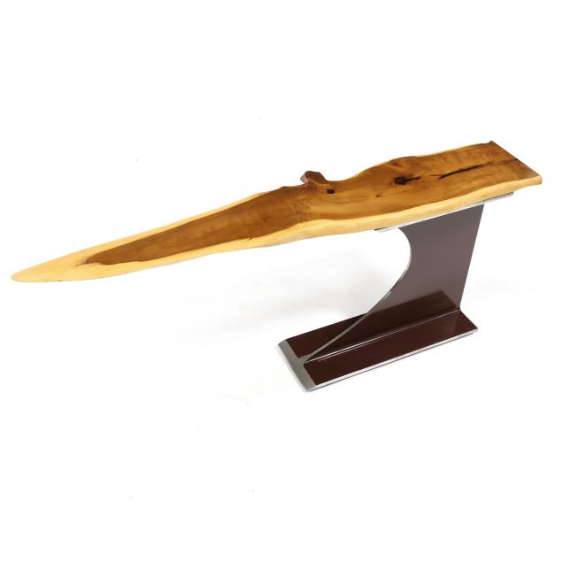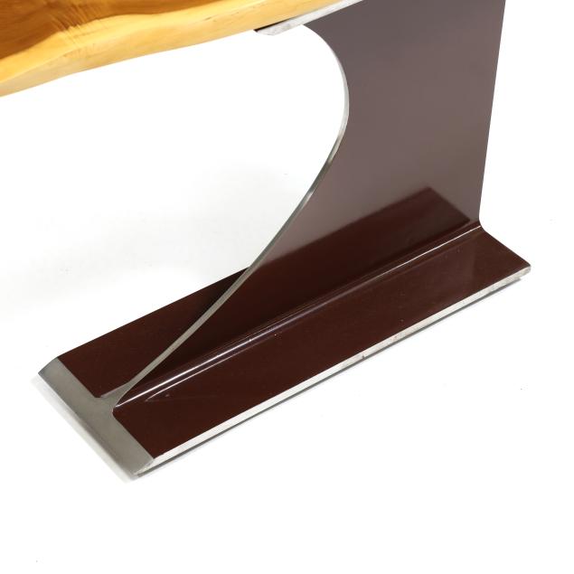2021, English Ewe live edge top mounted to a steel I-beam with red lacquered finish, ink signed to the underside.