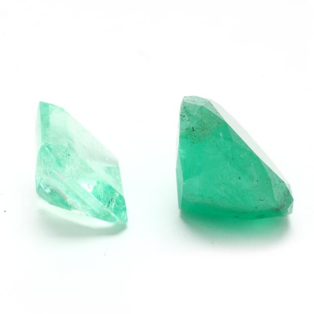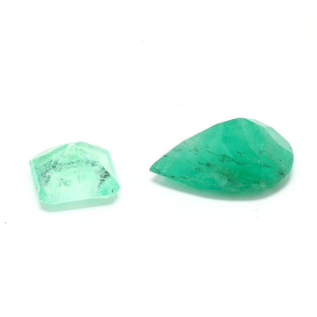 To include: a pear cut emerald (25.68 x 18.09 x 11.18mm) weighing 24.10 carats (actual) (emerald displays green hue, medium tone, and medium strong saturation); and an emerald cut green beryl (14.41 x 13.90 x 8.41mm) weighing 11.05 carats (actual) (beryl displays slightly yellowish green hue, light tone, and very slightly grayish saturation) (minor abrasions visible under 10x magnification).