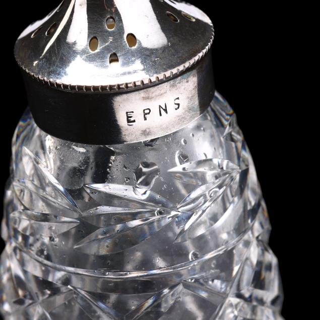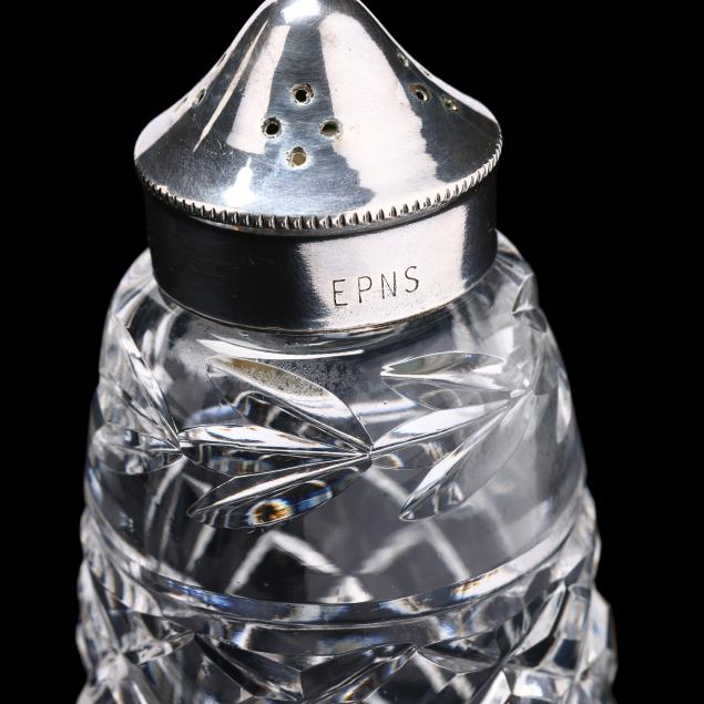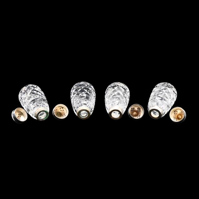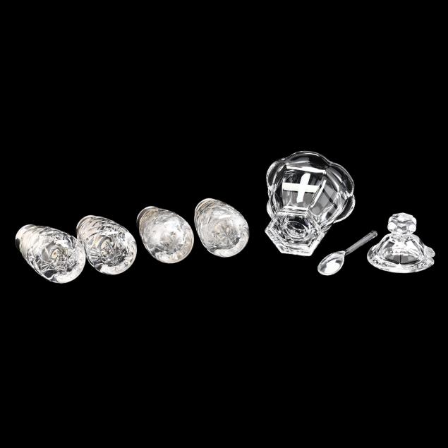 Late 20th century, including a Baccarat lidded jar with spoon (4.5 in.); and four Waterford crystal and silverplate shakers (4 in.), marked.