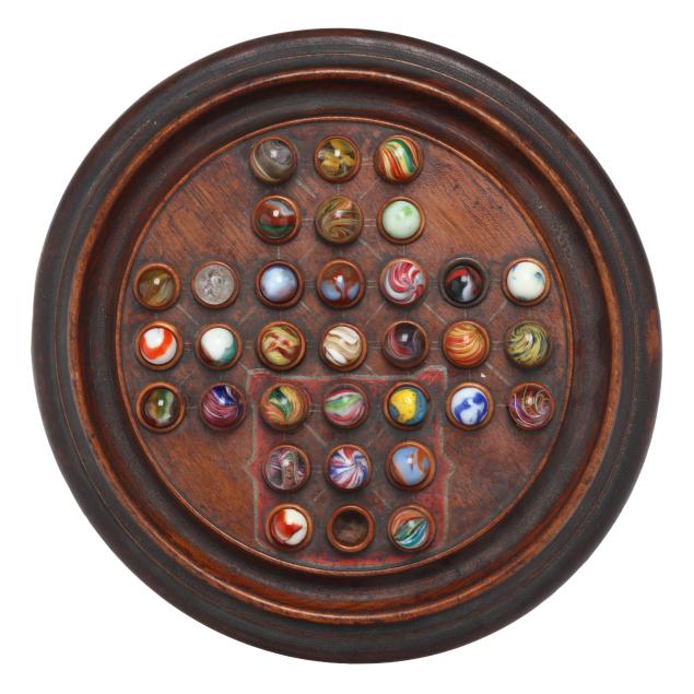 Late 19th century walnut and polychrome board, unmarked, round form with molded edge, with (33) conforming removable marble cups, raised on three bun feet. includes (32) vintage glass marble pieces.
