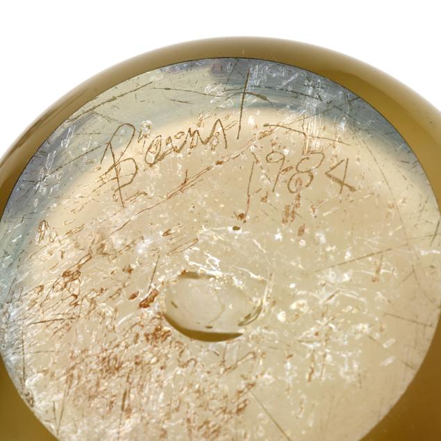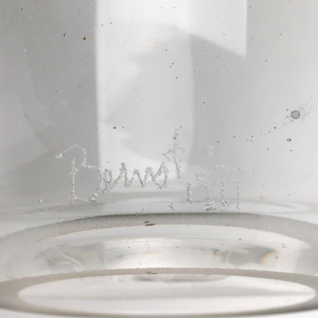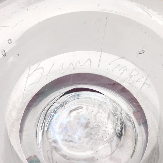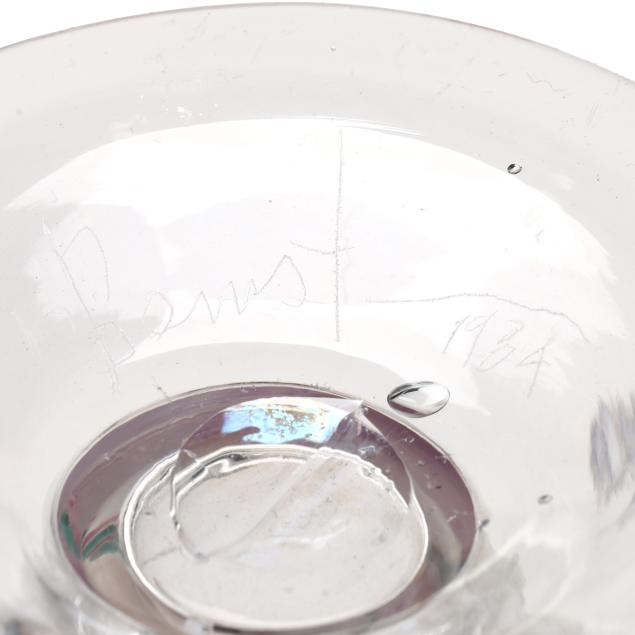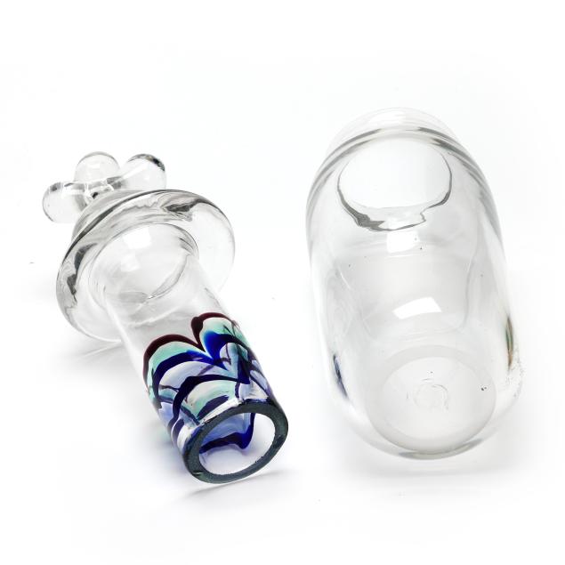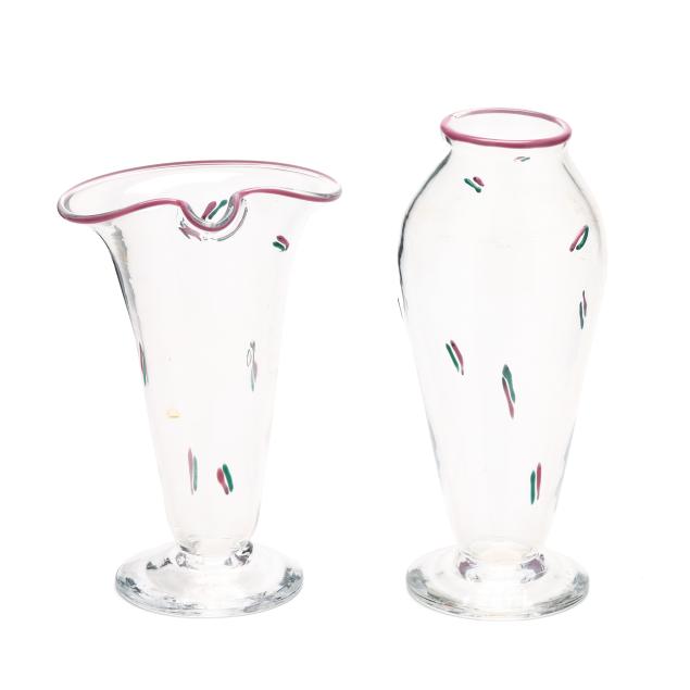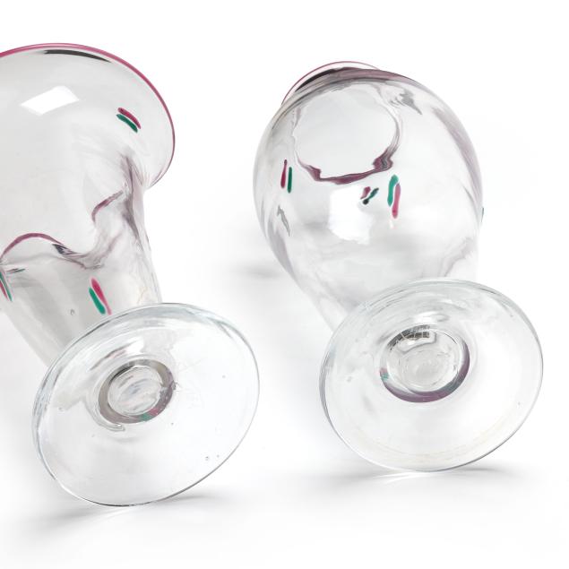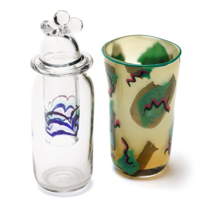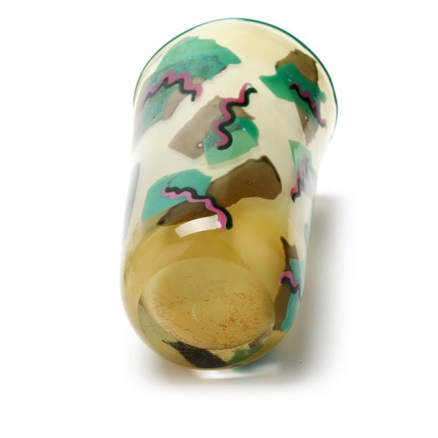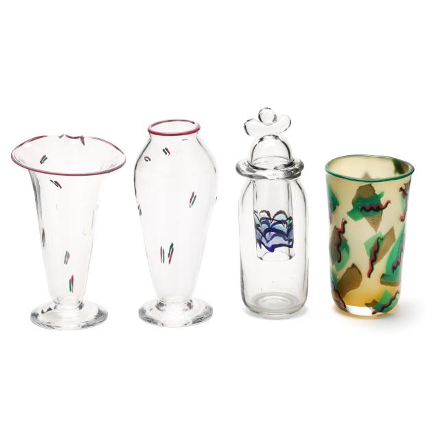 1977-1984, including a bottle with unusual multi color drop stopper (10.75 in.); a teal/pink accented pitcher (9 in.); a teal/pink accented baluster vase (9.75 in.); and a custard field vase with Memphis style abstract designs (7.5 in.), all signed.