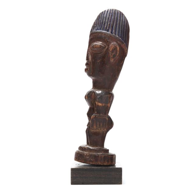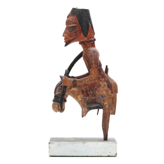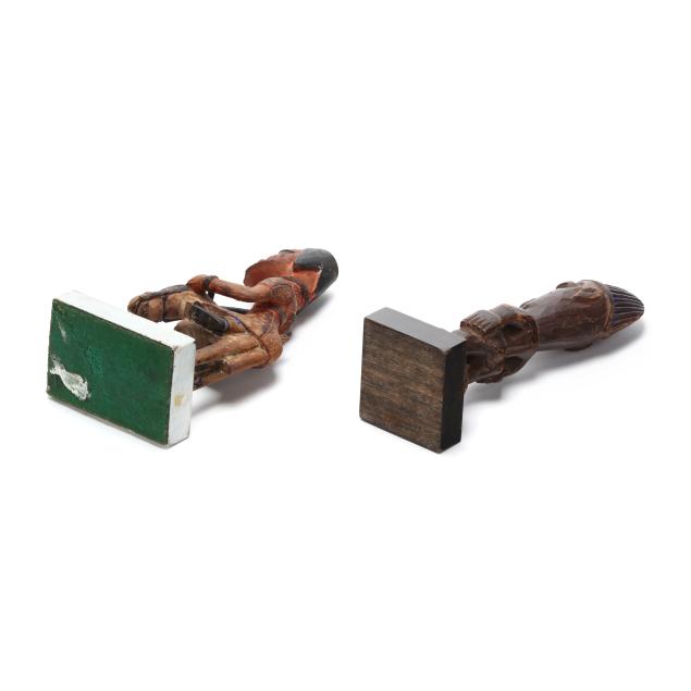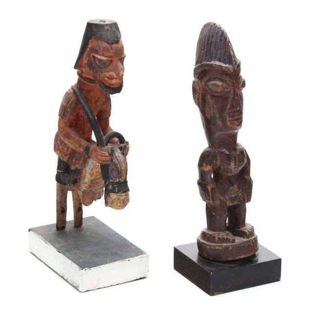 Nigeria, early to mid- 20th century, including a polychrome painted sculpture of the deity Shango on horseback (11 1/4 x 3 1/4 x 5 in.), and an Ere Ibeji twin figure with blue painted coiffure (11 1/2 x 3 1/2 x 3 1/4 in.), both mounted to wood stands.