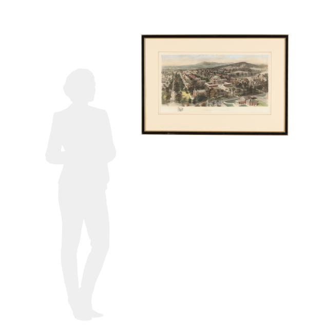 Hand-colored lithograph, 1907, depicting a bird's-eye view of the University's campus, published by W.T. Litting & Co., New York, matted and framed below glass.