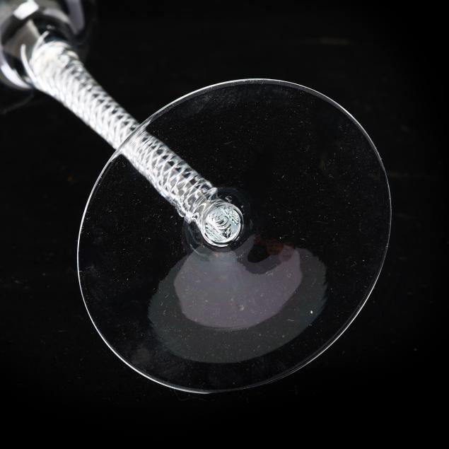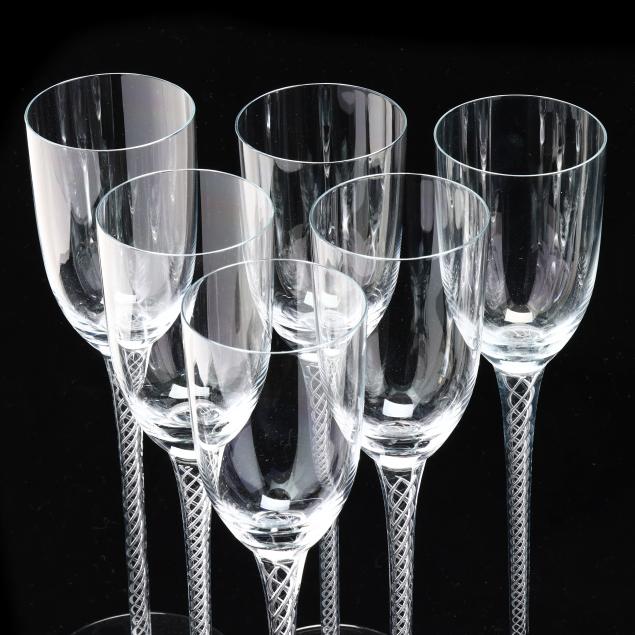 Second half 20th century, clear glass with thin cups and tapered tall air twist stems, unmarked.