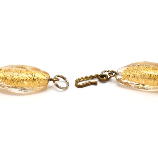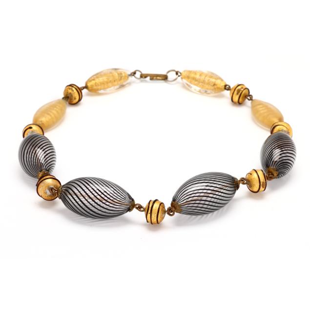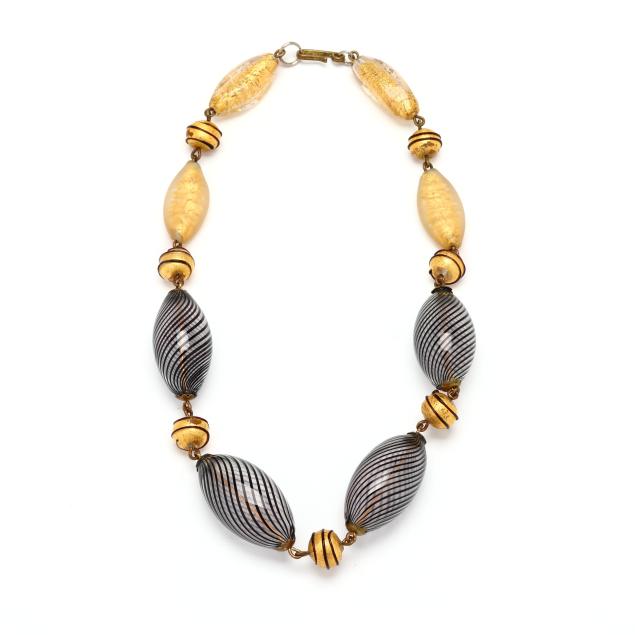 Attributed to the Murano region, the glass bead necklace with Foglia d'Oro (encased gold leaf) beads and filigrana black and clear swirl beads, completed with hook clasp, appears unsigned.